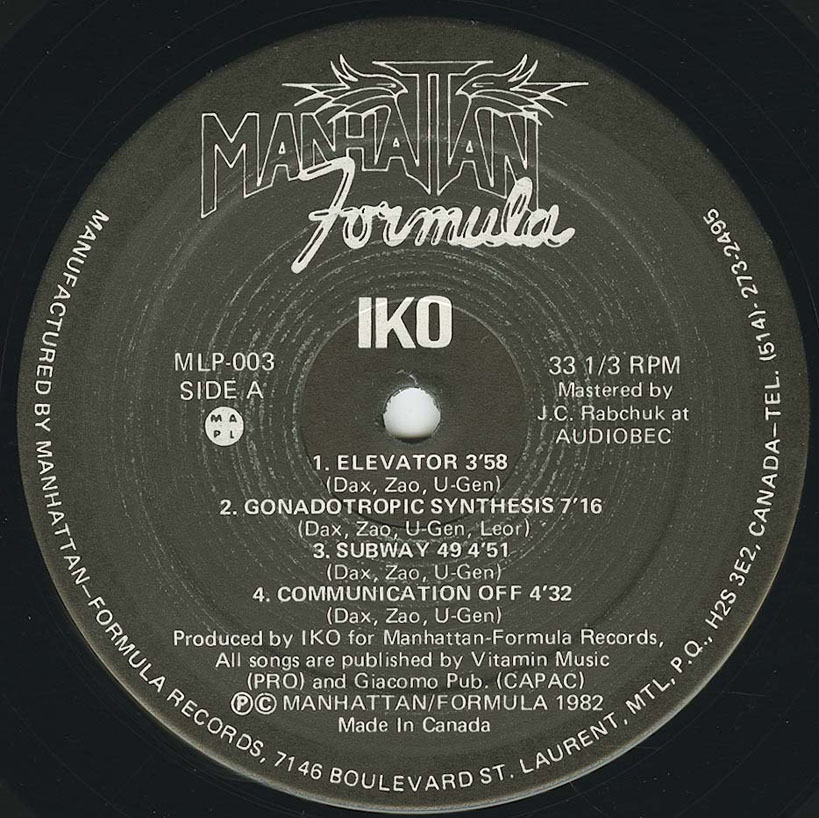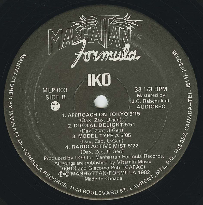 This coveted album by minimal synth aficionados around the globe has been out of print and very rare since it’s original release in 1982. Hailing from Montreal, Canada, IKO has always been shrouded in mystery. All 3 members come from an academic background (electroacoustic composition, etc), and they met at the University of Montreal in the music department. Taking from their collective influences of 60’s pop, prog and minimalist composers as well as early industrial, they played in a few early bands before solidifying the all-synth incarnation of IKO in it’s definitive lineup. The LP was originally released on Manhattan Formula. Other than Rational Youth, the Montreal synth scene was small, and the band broke up not too long after it’s release. Over the years, it has slowly achieved cult status of the highest order and now fetches inflated collector’s prices on the open market. It even prompted an unauthorized bootleg LP a few years ago (of much inferior sound quality). “Approach On Tokyo” sets the mood with it’s electro hooks and almost “Trans-Europe Express” synth parts. “Gonadotropic Synthesis” is an amazing slow and beautiful synthy melodic number which blurs the lines between love song and a lecture on hormonal interplay out of a medical textbook”. “Digital Delight” is a fast paced dance floor favorite with cyborg lyrics and catchy hooks.