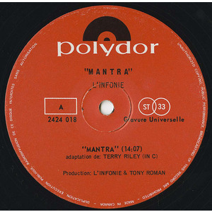 For it's second album, L'Infonie recorded Walter Boudreau's arrangement of Terry Riley's landmark piece for wind ensemble "In C," here re-titled "Mantra." Boudreau modified it in order to fit L'Infonie's possibilities, but he also added a rhythm section. Therefore, this is the grooviest version of "In C" ever recorded. The bass (electric) and drums support the piano's pulsation, while an assortment of percussion instruments are used to punctuate events as they happen in order to give the piece relief. Riley's score is made of 53 short events placed on a pulsation. Each player has to move from the first to the second to the third, etc., until he reaches number 53, but he can repeat each of them as many times as he wants. Therefore, the piece evolves through some kind of osmosis. This impression is very palpable in L'Infonie's interpretation. The studio they recorded in was using 30-minute tape reels, so the album fades out around number 48. In the liner notes, Boudreau announced the remaining part would be released on a future L'Infonie record, but that promise was never fulfilled.
