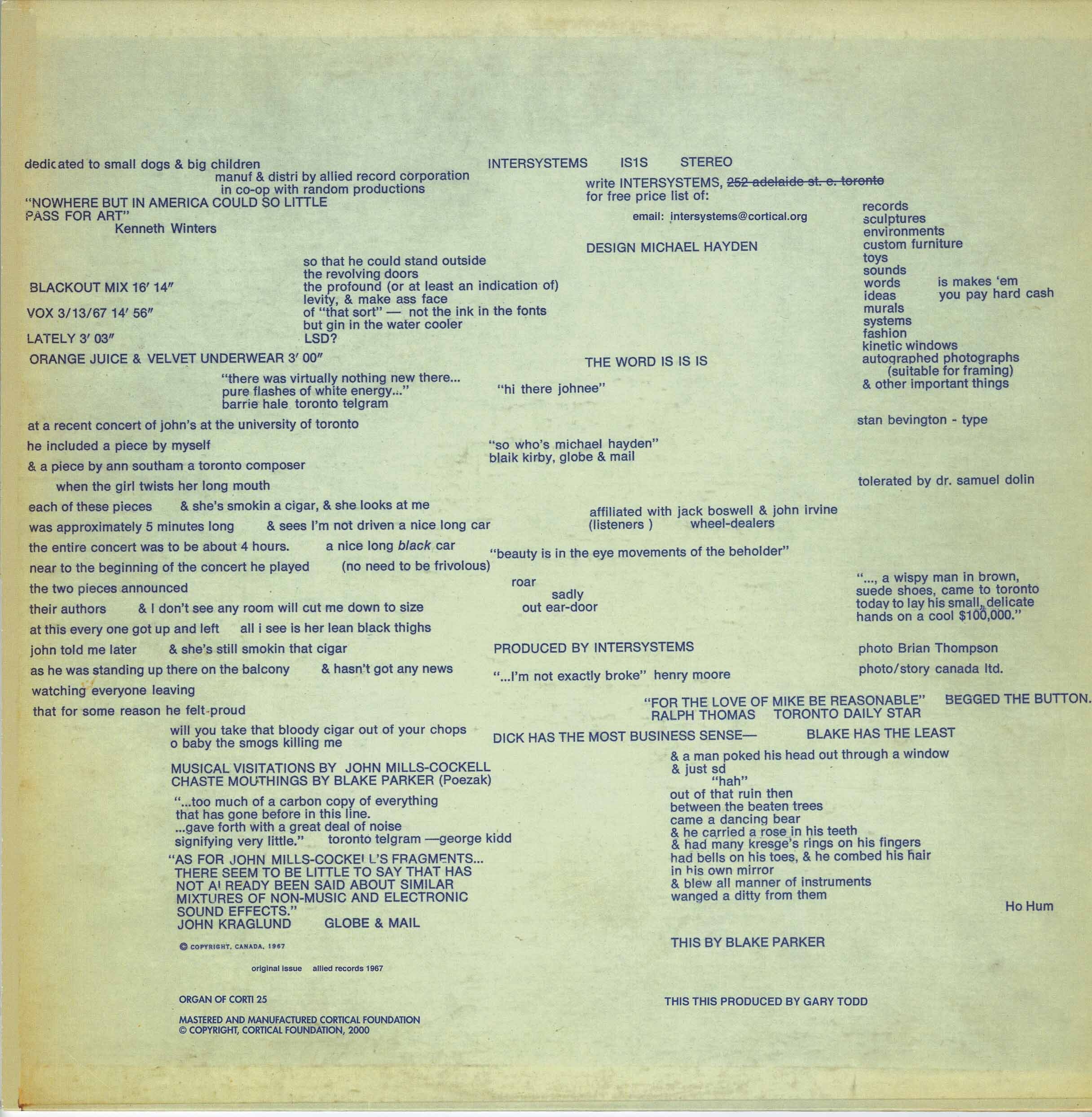 Limited edition of 500 copies. The first re-release of Intersystems' first LP in a 12" edition, in deluxe gatefold sleeve-heavy packaging. Drug induced wild electronics by John Mills-Cockell and trippy outsider narrative by Blake Parker. This special edition includes a reprinting of a very rare psychedelic comic book by Intersystems originally published in 1968, which you can see on the inside of the gatefold cover. The package offers a glimpse into the installations and psychedelic environments that Intersystems created (for example, the Mind Excursion Center) during the 1960's, with the time-capsule effect as reported by the media including the Toronto Telegraph and Time Magazine. (The Mind Excursion Center by Michael Hayden and Intersystems, was the pre-cursor to the Electric Circus in NYC, also designed by Michael Hayden) 220 Gram Vinyl. DMM Quality Pressing. Limited Edition 500 copies. State of the art packaging, full color gatefold sleeve perfectly reproduced, housed in a heavy plastic sleeve. "Orange Juice & Velvet Underwear" is the kind of poetry that will bring you to tears in the name of Canadian Love. Authentic avant-garde cultural replication doesn't get any better than this....Highly recommended!!