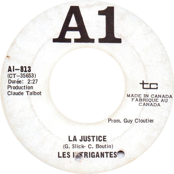In 1967, the group released what would become their most sought-after single: ‘Nous voici’ b/w ‘La justice’ on the A-1 label. This record pushed Les Intrigantes decisively into psychedelic territory, adapting Jefferson Airplane’s ‘White Rabbit’ and The Mamas & The Papas’ ‘Creeque Alley’ into French. Produced by Claude Talbot and promoted by Guy Cloutier, the single showcased the band at their most confident and experimental, with explicit credit given to each member’s instrumental role—an uncommon distinction for the era.