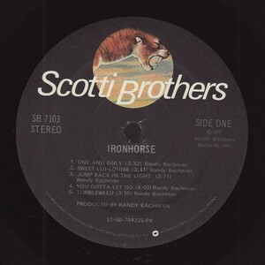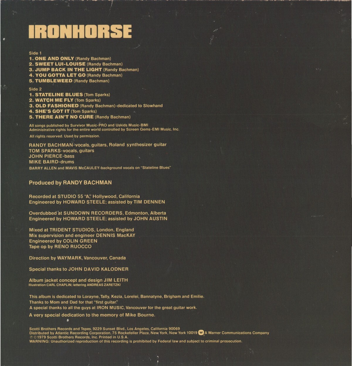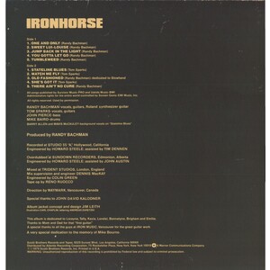 Ironhorse was a Canadian rock band formed in 1979 by Randy Bachman following his departure from Bachman-Turner Overdrive (BTO). Frustrated by the creative limitations he faced on Freeways and looking for a new musical outlet, Bachman returned to the West Coast and began writing new material while producing albums for artists like Trooper. Teaming up with Washington State guitarist/vocalist Tom Sparks, bassist John Pierce, and drummer Mike Baird, the new group signed a deal with Scotti Brothers Records and entered Studio 55 in Hollywood to record their self-titled debut album.