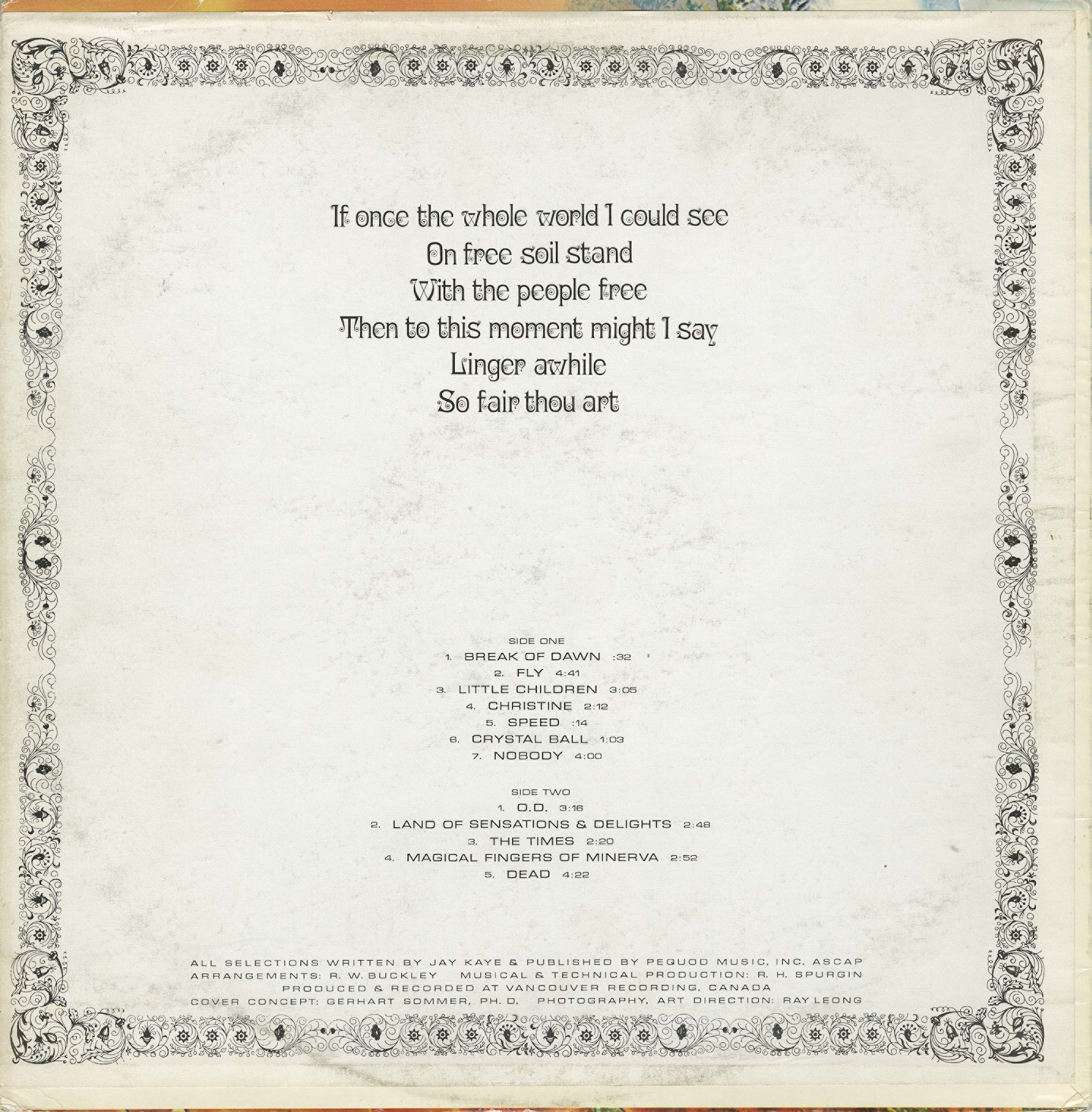 Jay Kaye was only 15 years old when he recorded this album in 1968. The lyrics, vocals, songs and musicianship are remarkably advanced for someone who was so inexperienced in the studio. Jay Kaye made the trip from Las Vegas to Vancouver, Canada to record the lp with top flight session musicians (among them members of noted Vancouver band Mother Tucker’s Yellow Duck). The album was inspired by recent Beatles’ masterpieces and of course LSD, so it’s not surprising that much of this record is full of orchestral psychedelia and heavy studio effects – music with a spiritual slant. Another teen, Robert Buckley aided Jay Kaye with many of the album’s arrangements and psychedelic effects. It was he who created the decaying backward effects on the masterful “Fly,” a track that sounds well ahead of its time and similar in feel to prime-era Radiohead (though 30 years prior).