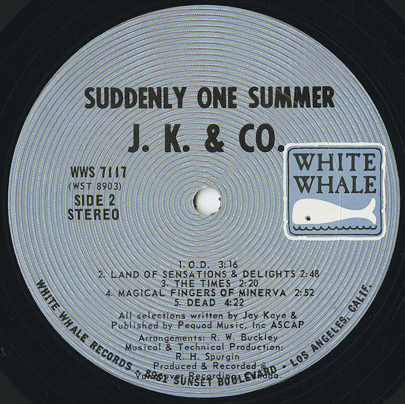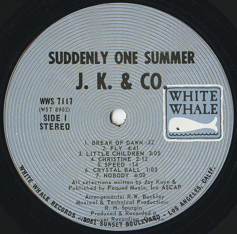 J.K. & Co.’s album was a decent size underground hit in California, leading White Whale to release a single to capitalize on the group’s popularity. They chose the 36-second album opening intro which at the time was seen as a major marketing disaster. In the end, White Whale’s terrible management blunder would halter the career of Jay Kaye and also hurt the company’s ability to market J.K. & Co as a serious group. After the record’s release Kaye had even put together a band with his Cousin John (bass) and friend Rick Dean (drums) to promote the LP’s songs live but success eluded them. In 2001 Sundazed released this great conceptual acid album through their BeatRocket label.