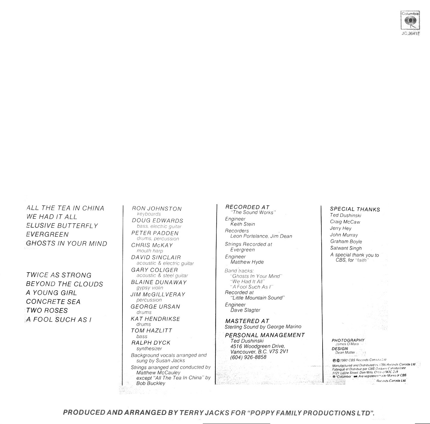 Produced and arranged by Terry Jacks for “Poppy Family Productions Ltd.”