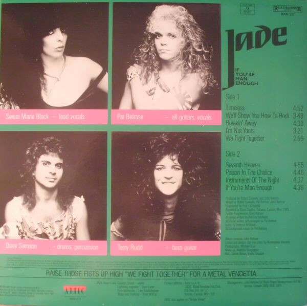 Jade was a Canadian heavy metal band formed in Winnipeg, Manitoba in 1982 by guitarist Pat “Buzz” Belrose and his brother, manager John Belrose. After touring the western club circuit, the band relocated to Ottawa in 1983 and recorded their debut album Teasing Eyes (Zaphia Records, 1984). The record reached #8 on the Kerrang! UK charts and attracted the attention of Roadrunner Records, leading to a multi-album deal—the first ever signed between the Dutch label and a Canadian act.