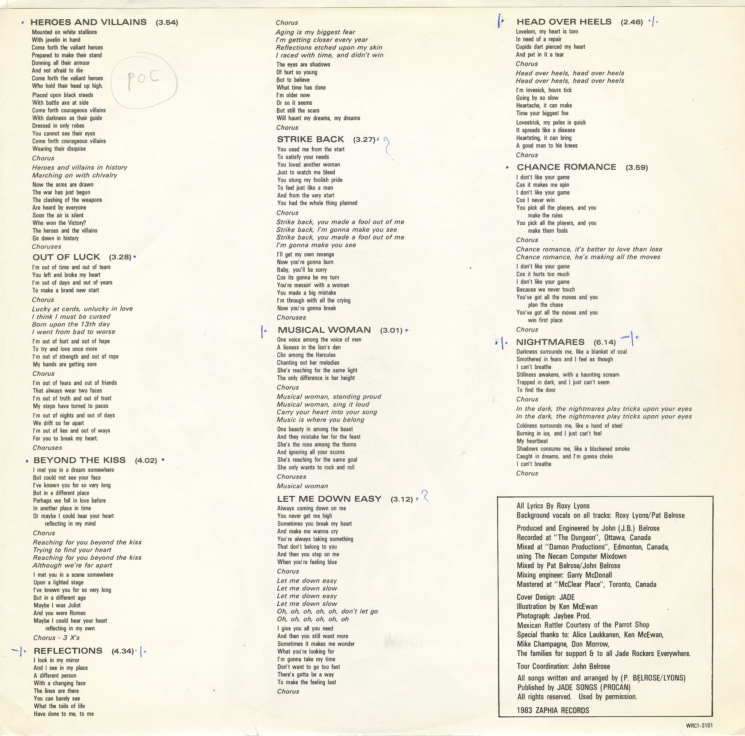 Jade toured extensively across Canada, the U.S., and Europe, developing a strong following in Québec and abroad. After Black’s departure in 1987, the band continued briefly with male vocalists Peter Rieker and Jamie Lee Saint, releasing a final EP on the Last Music label before disbanding. Teasing Eyes was reissued in 2009 by Maple Metal Records.