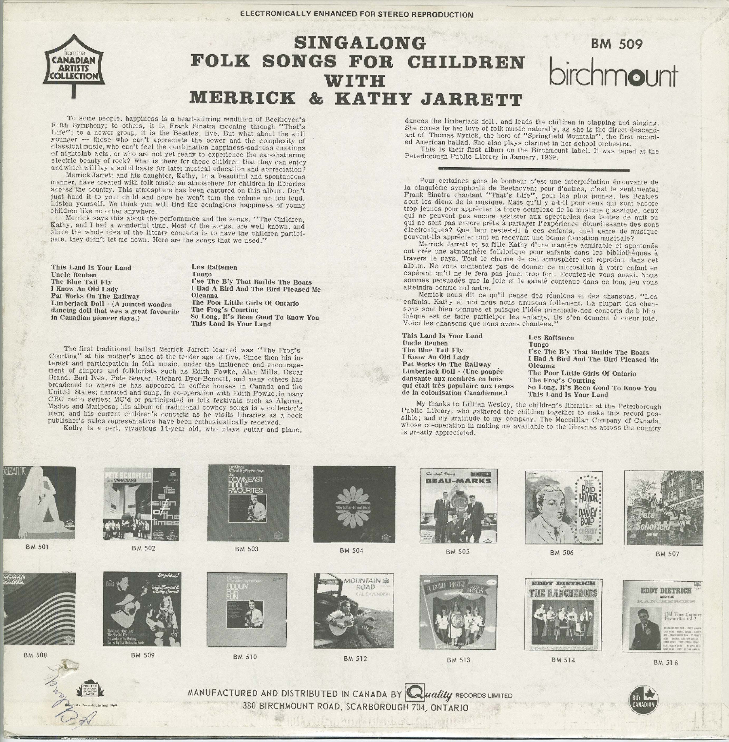 Merrick Jarrett began his musical career as a singer of cowboy songs on radio stations in the fifties. He had his own folk music program on CKEY in Toronto, and performed regularly on the CBC on Edith Fowke’s folk music program. He was a performer at the first Mariposa Folk Festival and has shared many festival stages with names such as Gordon Lightfoot, Ian and Sylvia, The Weavers and Joan Baez.