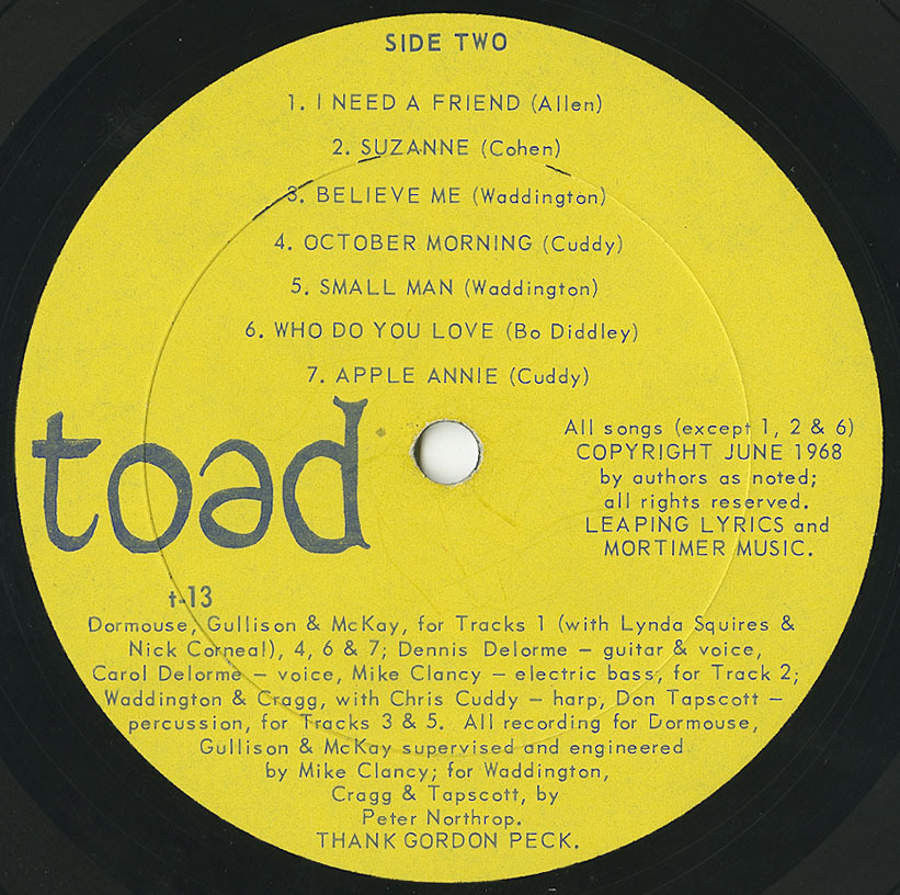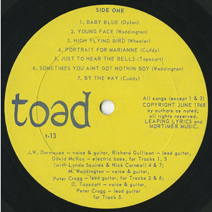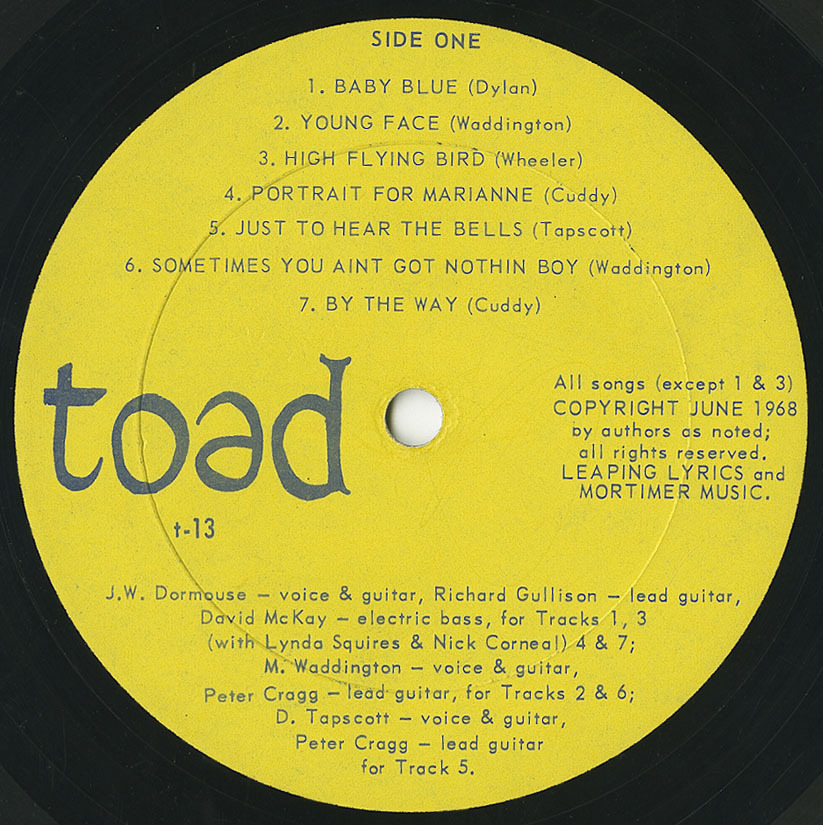 Dormouse had previously been with a late sixties folk outfit, The Rejects, who also put out an ultra-rare privately-pressed album. He is supported by a range of backing musicians on this horrendously rare privately-pressed album, which was housed in a beautiful silk-screen sleeve. Four of the tracks - Portrait For Marianne, By The Way, October Morning and Apple Annie - were penned by Chris Cuddy, one of the supporting musicians and four others - Young Face, Sometimes You Ain't Got Nothing Boy, Believe Me and Small Man by another, M. Waddington. There are interesting interpretations of Dylan's Baby Blue and Bo Diddley's Who Do You Love, but the highlights of this superb album are the vocals of Reign Ghosts' Linda Squires on High Flying Bird and Leonard Cohen's Suzanne.