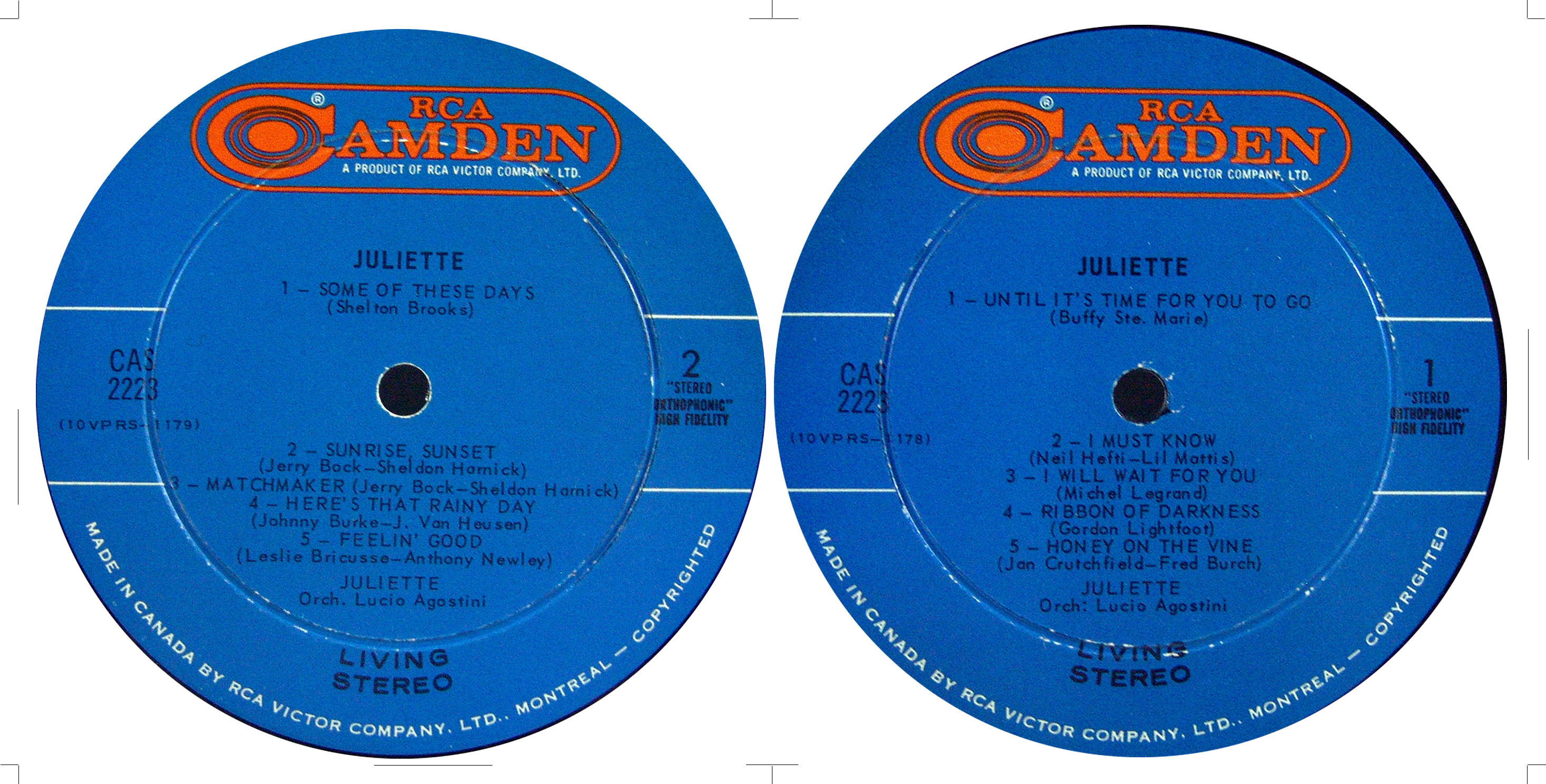 By the mid-sixties the ratings had dipped and, in CBC executive's jargon, “scored low on the enjoyment index” and the show was given the axe. The dresses went up for sale and became highly sought after fashion items, purchased by connoisseurs: Vancouver's drag queens. Impersonating “our pet Juliette” scored very high on the queen's “enjoyment index.” She was made a member of the Order of Canada in 1975 and in 1999 given a star on Canada's Walk of Fame in Toronto. Juliette recorded two 78s for RCA's 'X' label and one with the Rhythm Pals for Aragon in the early 1950s and later made three LPs for RCA Camden. CBC also recorded many transcription discs of the Juliette show. Harshly criticized by the high brow media for her kitschy pop, she would venture on occasion in folk territory. Using her popularity, she notably promoted Canadian authors by introducing their songs to a national audience.