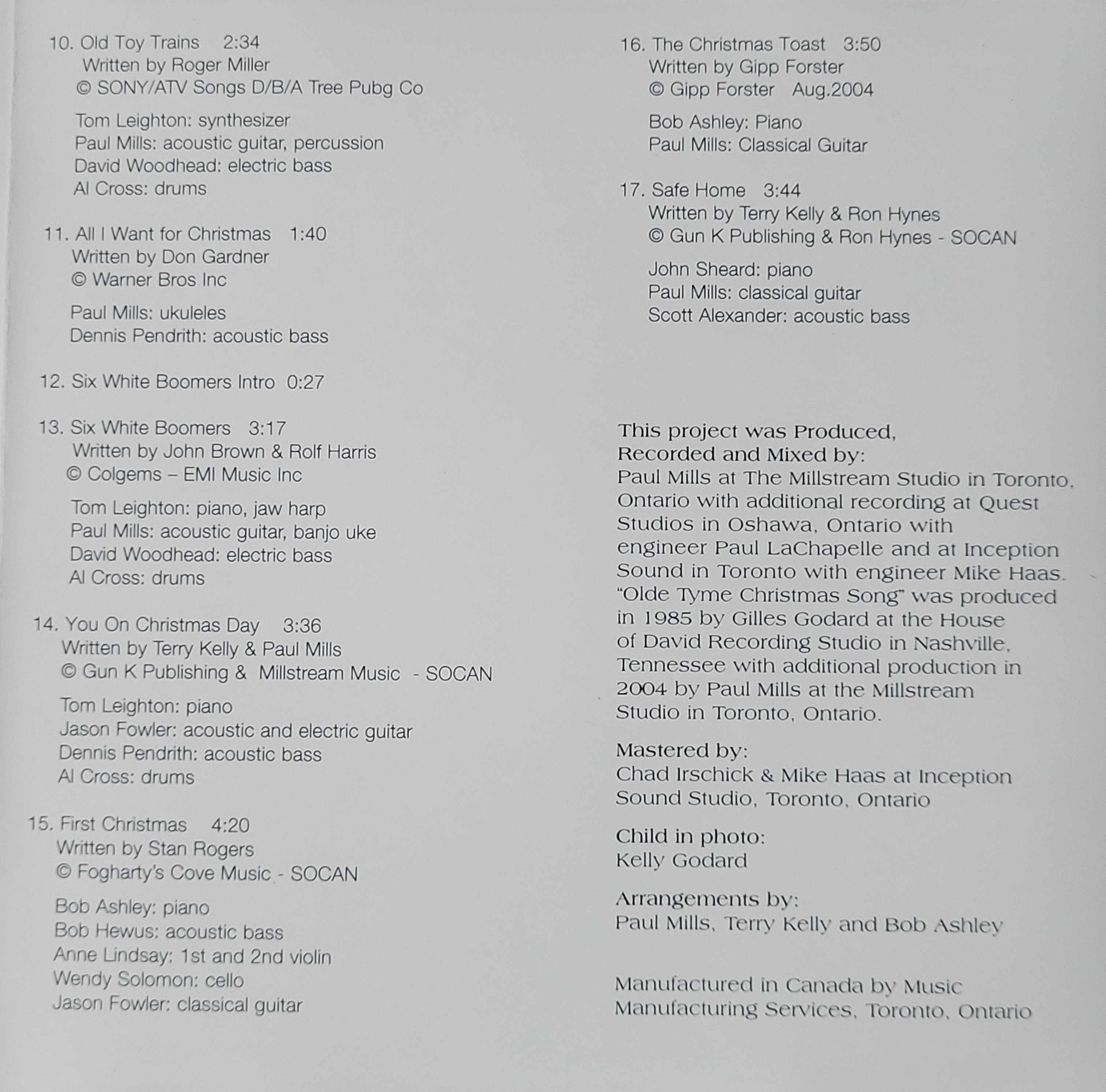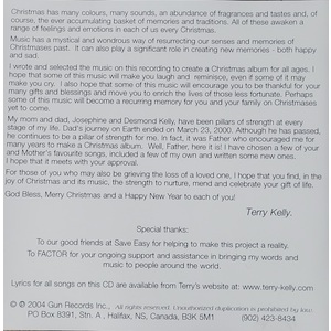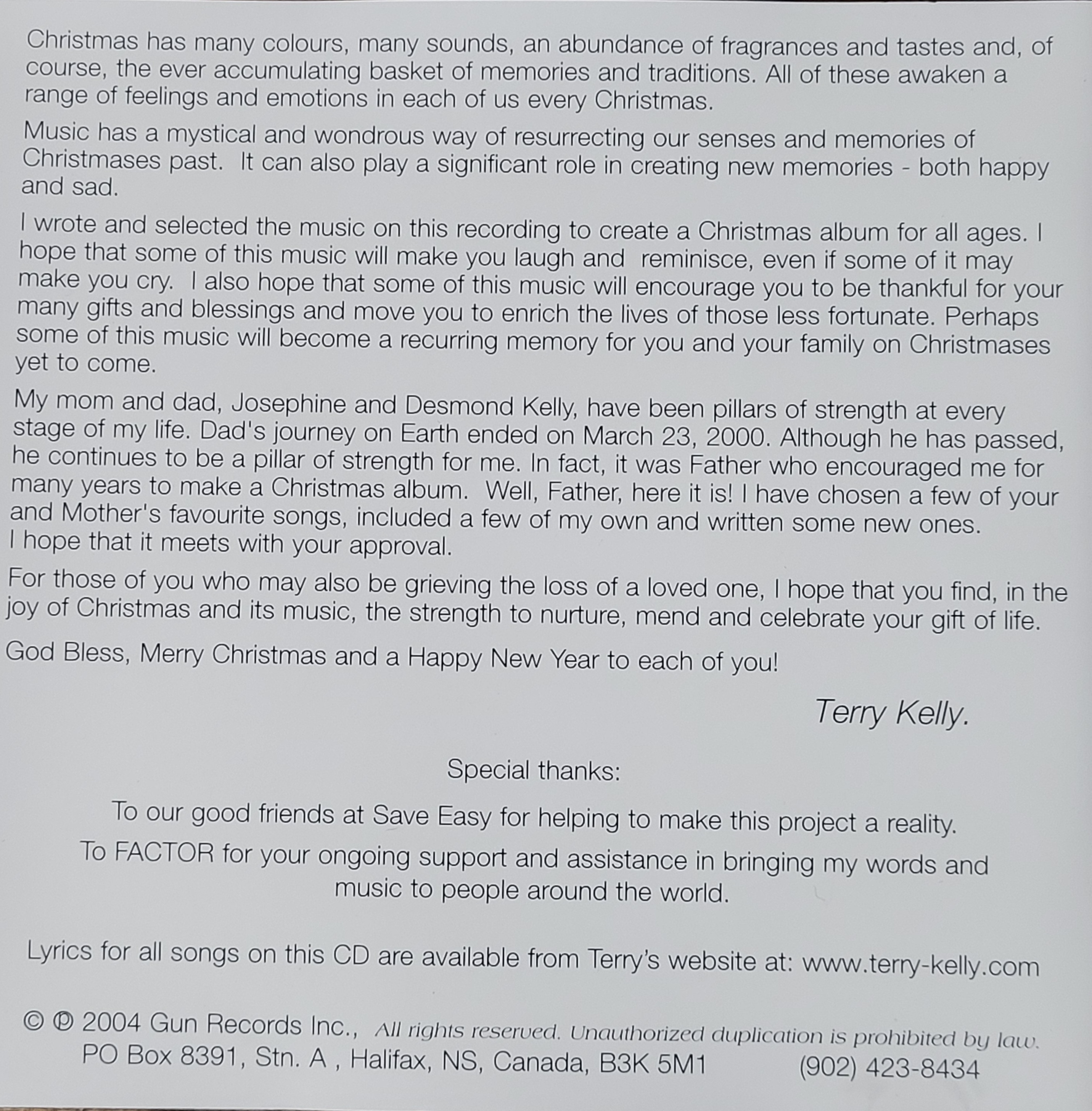 I wrote and selected the music on this recording to create a Christmas album for all ages. I hope that some of this music will make you laugh and reminisce, even if some of it may make you cry. I also hope that some of this music will encourage you to be thankful for your many gifts and blessings and move you to enrich the lives of those less fortunate. Perhaps some of this music will become a recurring memory for you and your family on Christmases yet to come.