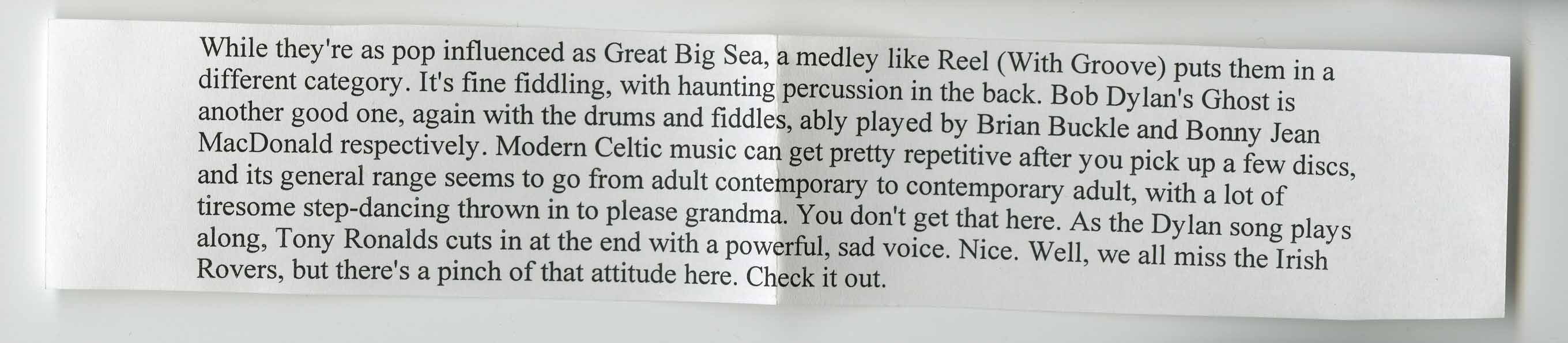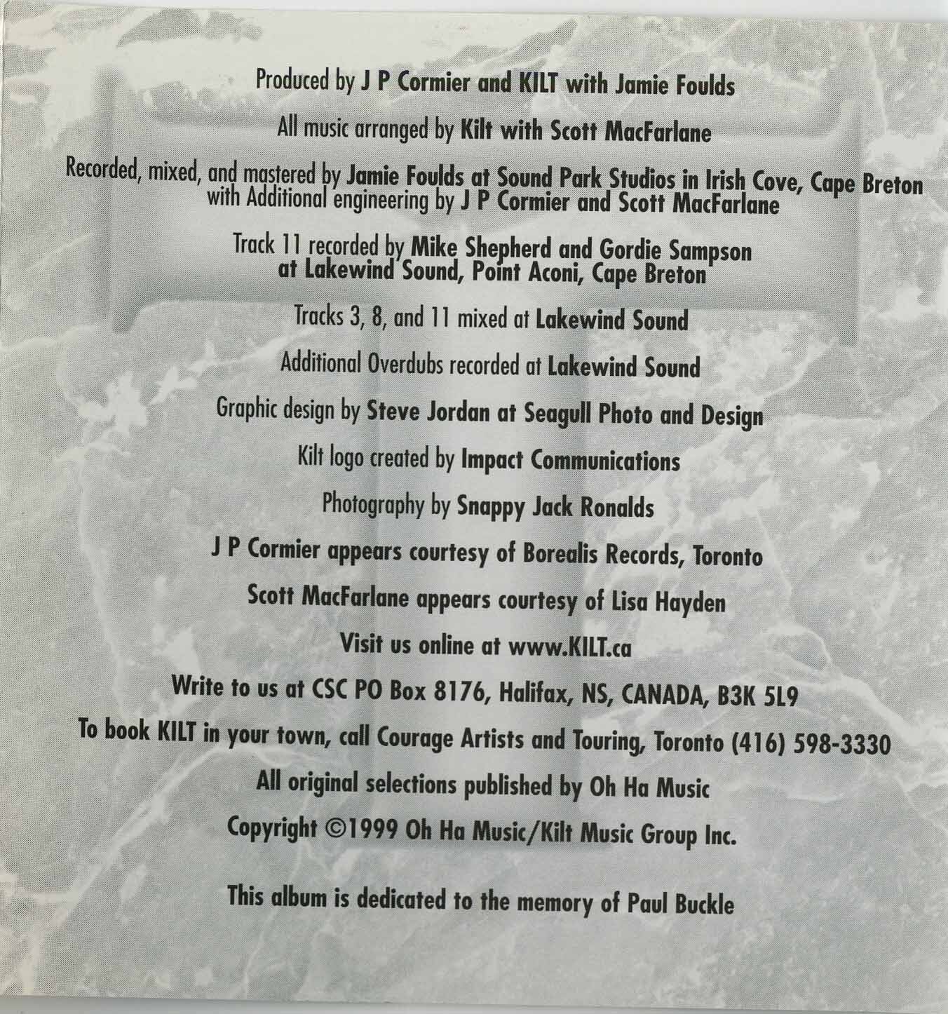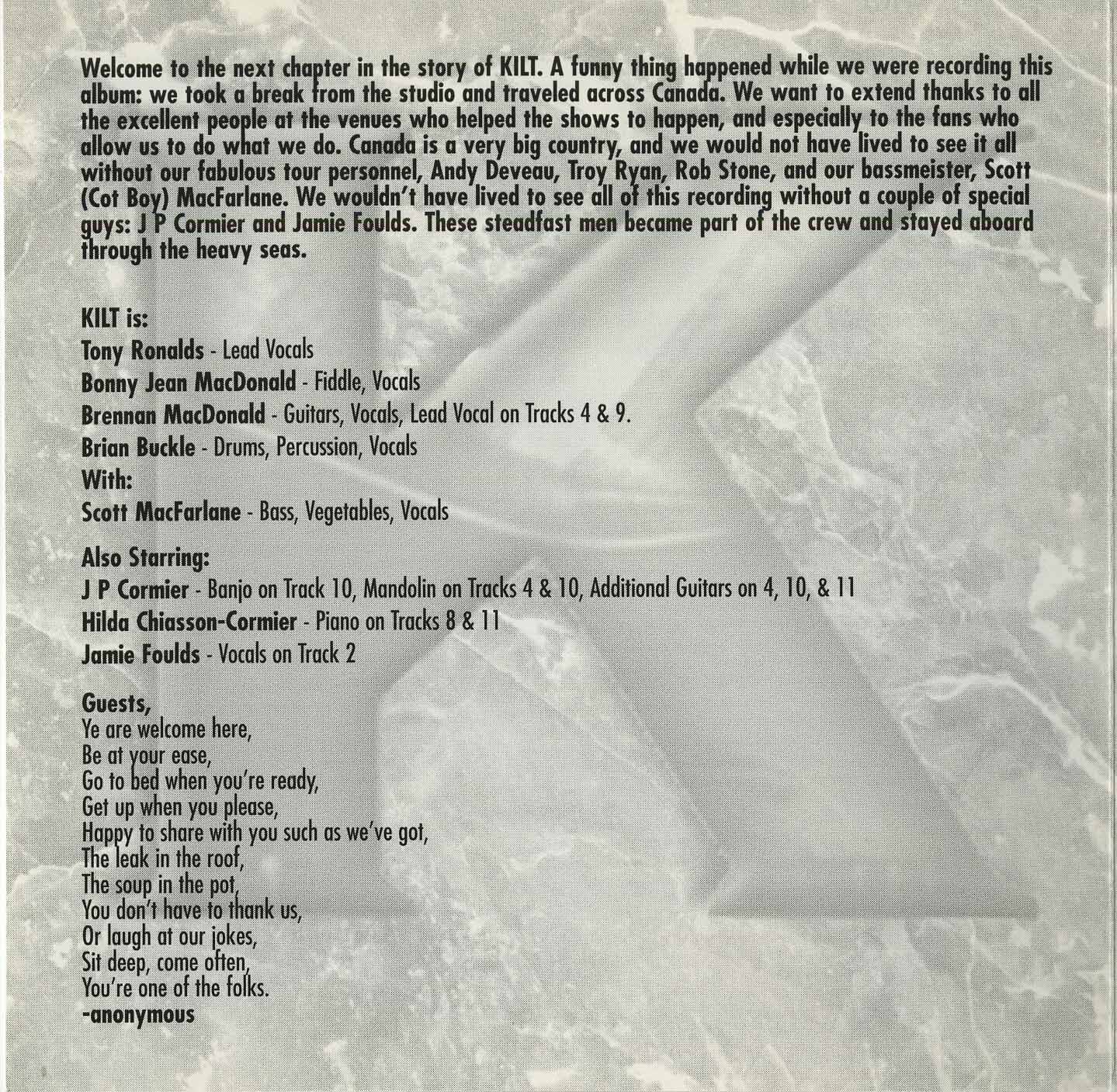Releasing only two albums before calling it quits, they gathered fans like no other. They sang from the heart, played like there was no tomorrow and had enough talent to astonish even those who don't like Celtic music. They reminded us what it was that brought us to the style in the first place. Coming along just as many of the original groups of the Canadian Celtic revival of the 1990s were going mainstream or breaking up, to be replaced by second-rate groups riding on the popularity of the originals, Kilt stepped in, played it properly and brought us back to the fold.