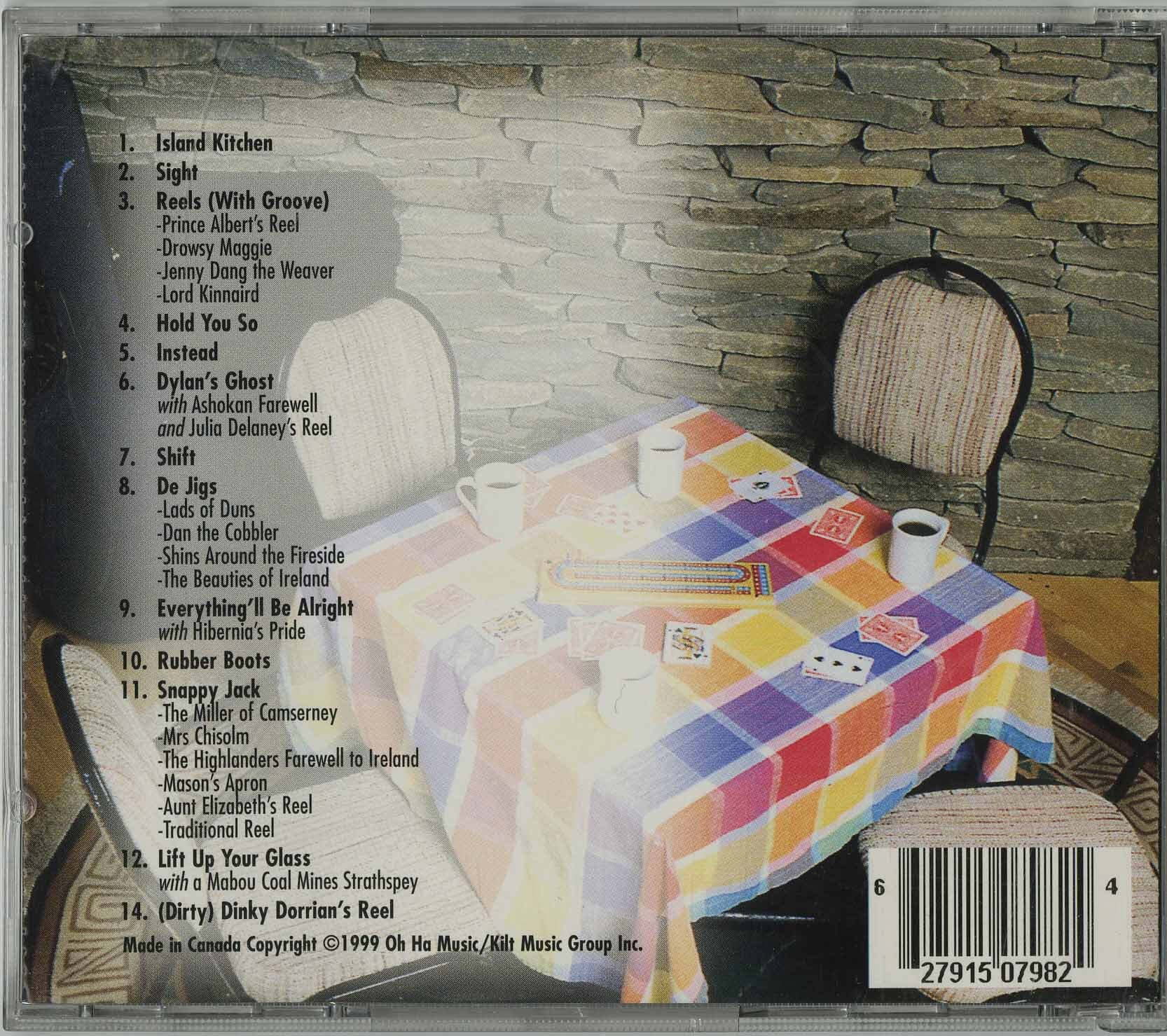 The songs cover a lot of ground, from happy party songs such as "Island Kitchen" and "Lift Up Your Glass," recorded live, to love songs like "Hold You So." "Prince Albert's Reel" was written by Bonnie Jean for Prince Albert of Monaco after he saw their show. "Dylan's Ghost" features Bonnie Jean's fantastic fiddle playing and vocals that have a haunting quality to them. "Shift" and "Everything'll Be Alright" display the talented writing and playing of all members of the group, as well as the folksy singing of Ronalds and MacDonald. The final track "(Dirty) Dinky Dorrian's Reel" is played on the electric guitar, which is a bit of a shock after all the traditional style fare. The instrumental sets are amazing. All the members are fantastically skilled and the inspired arranging contains all the energy of a live show.