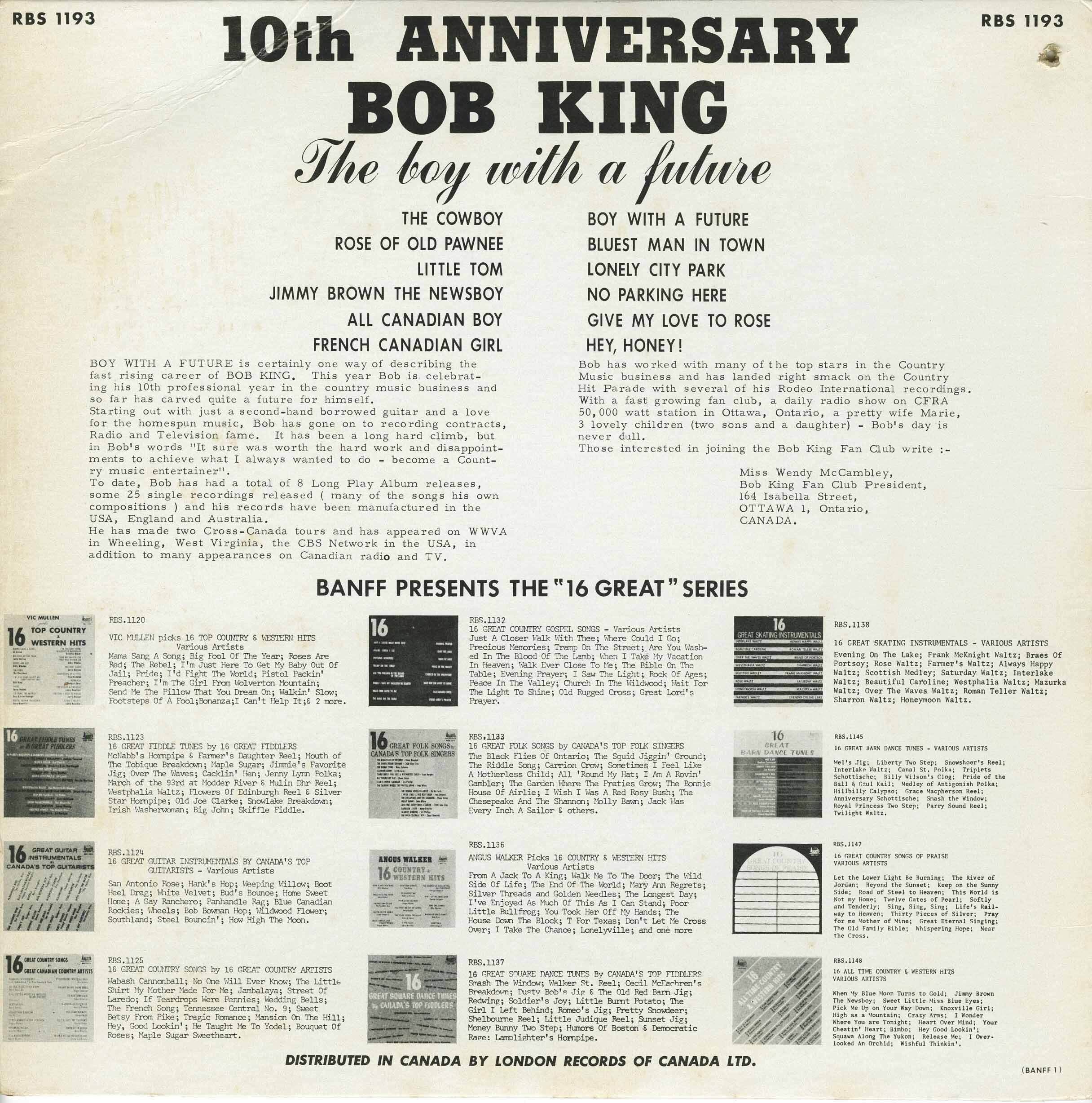 Prolific Canadian country music pioneer with his 9th album containing 4 originals - Bluest Man in Town, No Parking Here, The Cowboy, and All Canadian Boy. French Canadian Girl was written by Ken Davidson. Lonely City Park was written by Stu Phillips.