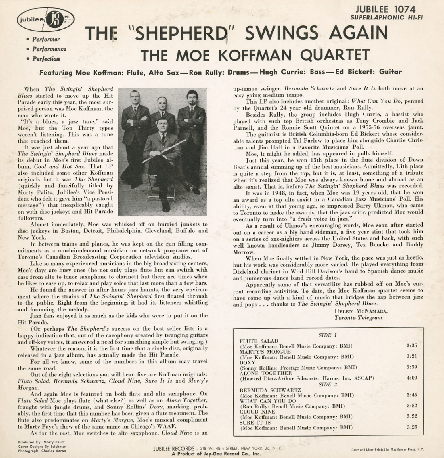 âI was just back from my âturnâ with the best trio, thirty weeks that beat the pants off a year spent in New York,â Moe said, âand I was trying to get back into the groove. Then the word came that my record, Cool and Hot Sax, that Jubilee had released the fall before, had started to move. The Shepherd was on the other side. Next thing I knew it was on a dozen top selling charts: Cash Box, Billboard, Variety, Musician, Canadian Music Trade, Liberty, Melody Fair, Sam the Record Man, and the best of allâMonty Hallâs (Jubileeâs Vice President for Canada).â