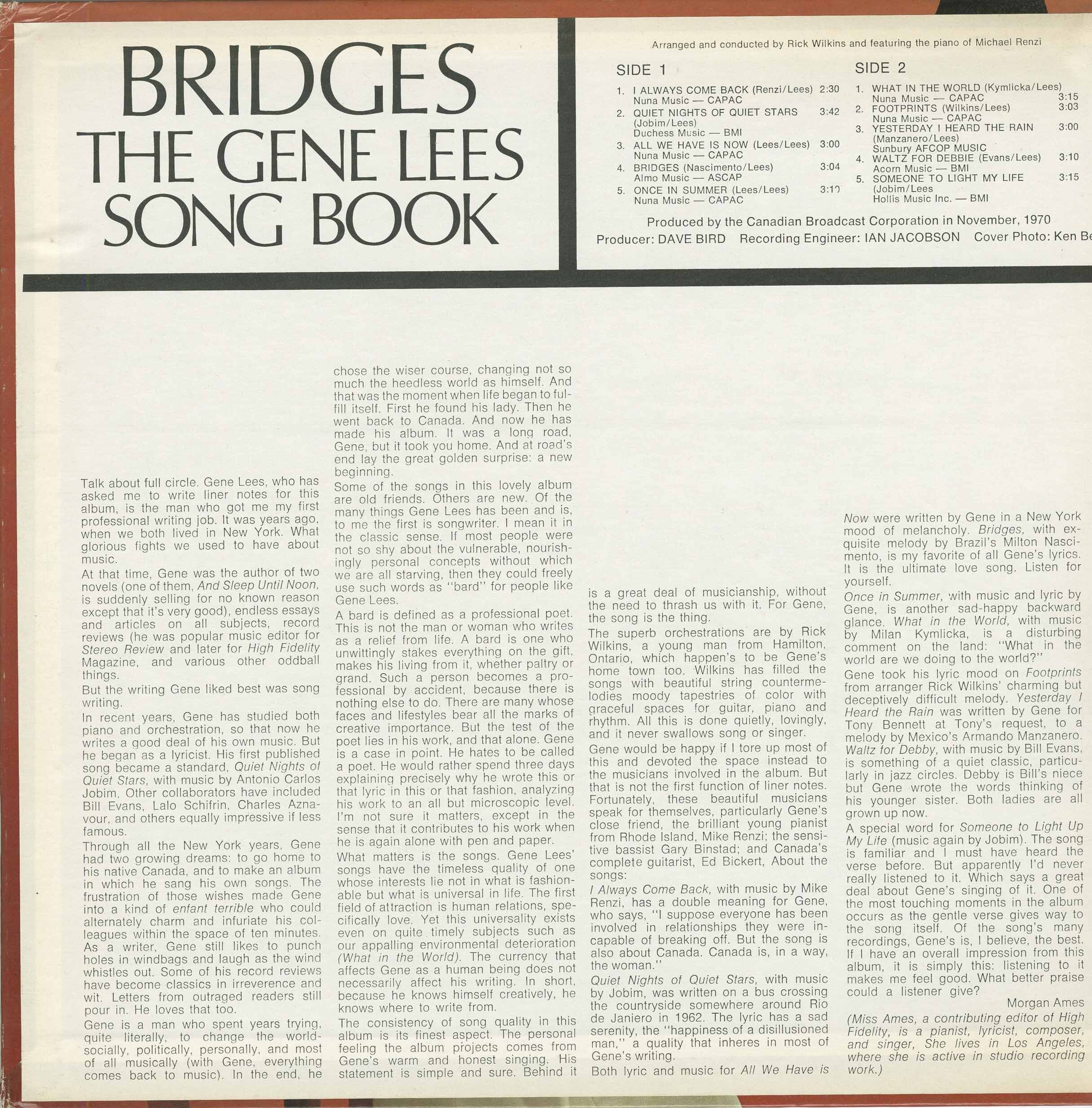 Talk about full circle. Gene Lees, who has asked me to write liner notes for this album, is the man who got me my first professional writing job. It was years ago, when we both lived in New York. What glorious fights we used to have about music.