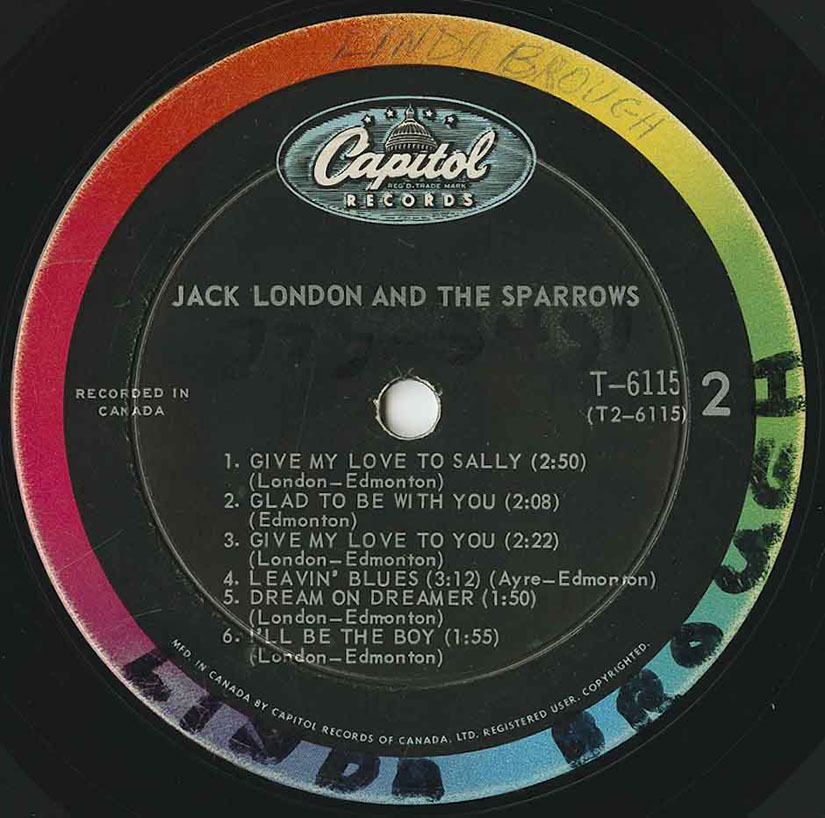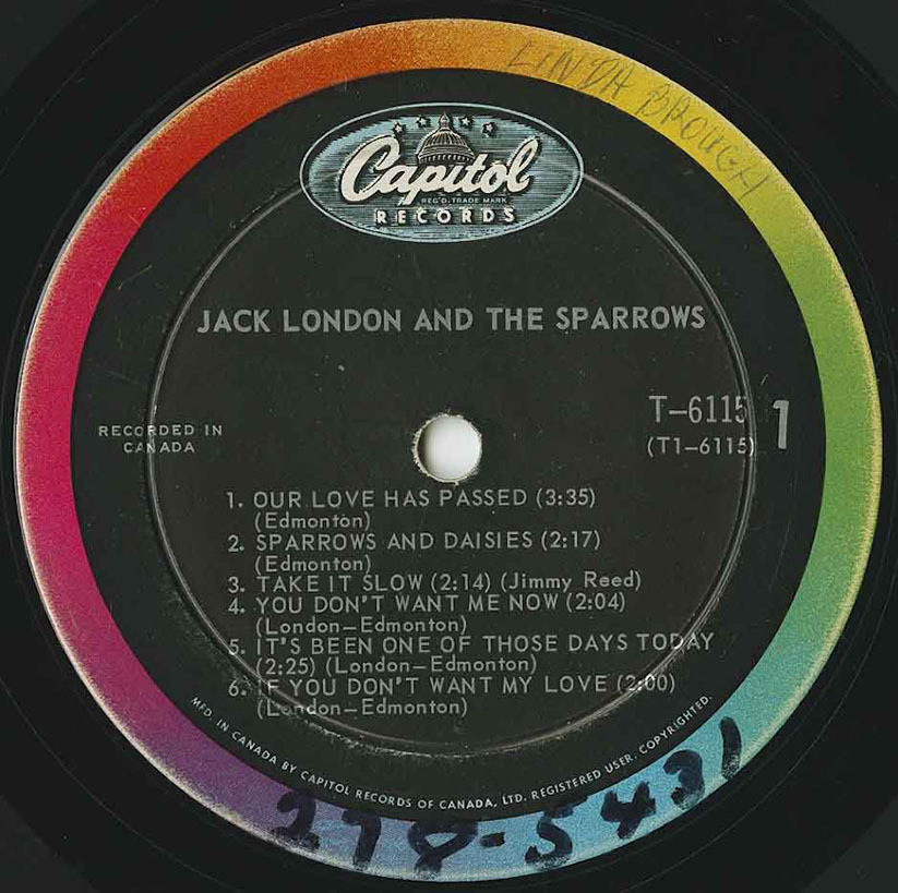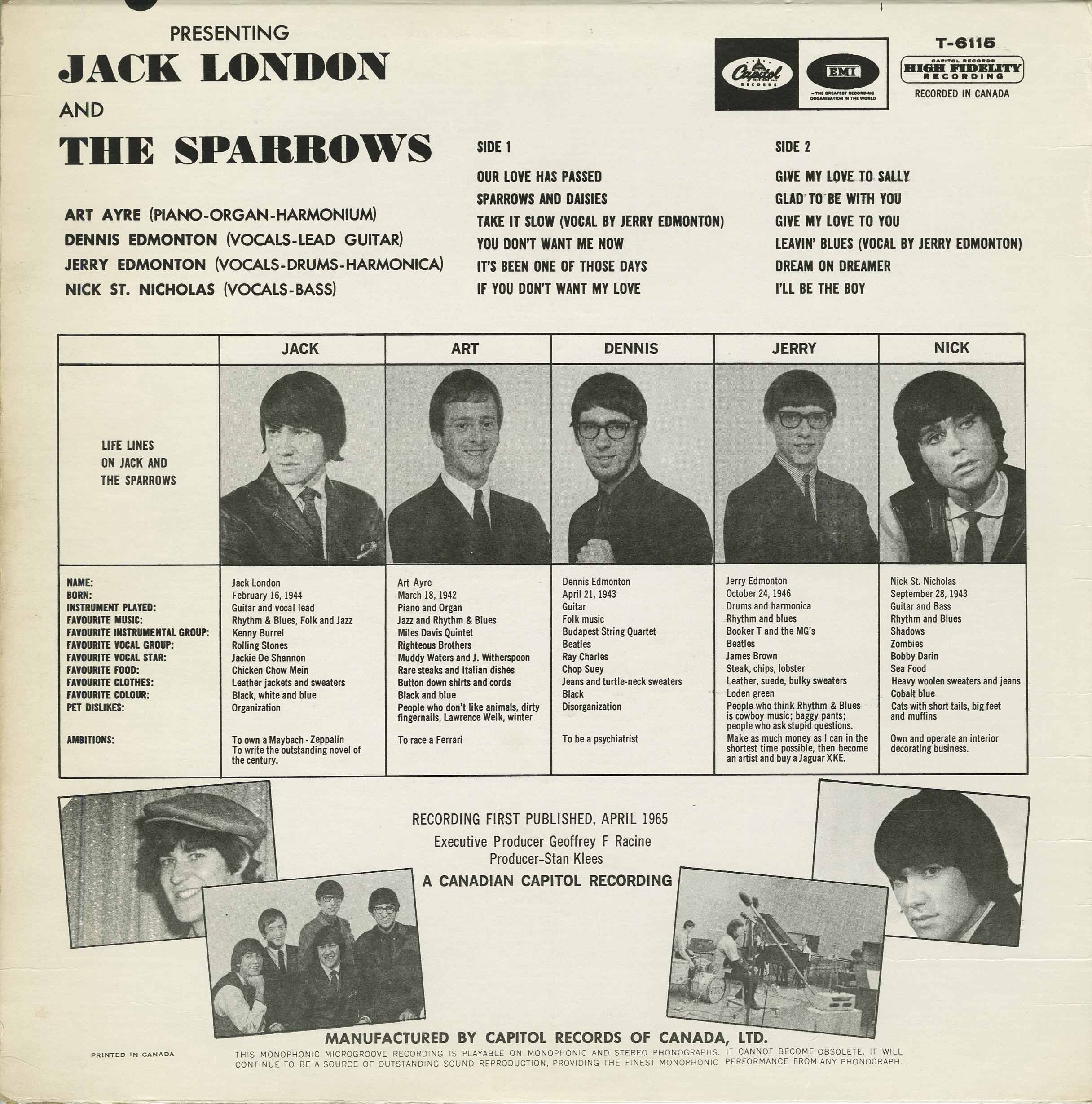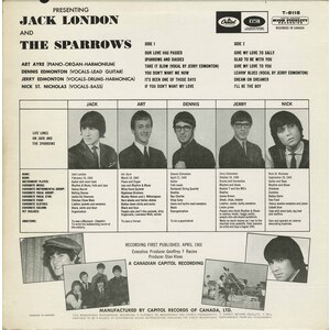 Jack London & The Sparrows were formed in Oshawa, Ontario in 1964 and this incarnation of the band featured Jack London (born Feb 16, 1944 in London, England) on guitar and vocal lead; Dennis Edmonton (born April 21, 1943 in Oshawa, Ontario) on vocals and guitar; Jerry Edmonton (born October 24th, 1946 in Oshawa, Ontario) on vocals, drums and harmonica; Art Ayre (born March 18, 1942 in Toronto, Ontario) on piano, organ and harmonium; Nick St. Nicholas (born September 28th, 1943 in Hamburg, Germany) on guitar, bass and vocals. John Kay would later join the band and together they formed Sparrow and went on to form Steppenwolf sans Art Ayre, Jack London, and Dennis Edmonton (Mars Bonfire). But together, they had some chart success with this album as well as 4 singles on the Capitol label and one single on RCA Victor. This album was recorded in Canada and was released in April, 1965 on Capitol T-6115. The executive producer was Geoffrey F Racine. It was produced by Stan Klees. The album is one of the rarer Capitol 6000 series releases and is hard to find a clean copy.