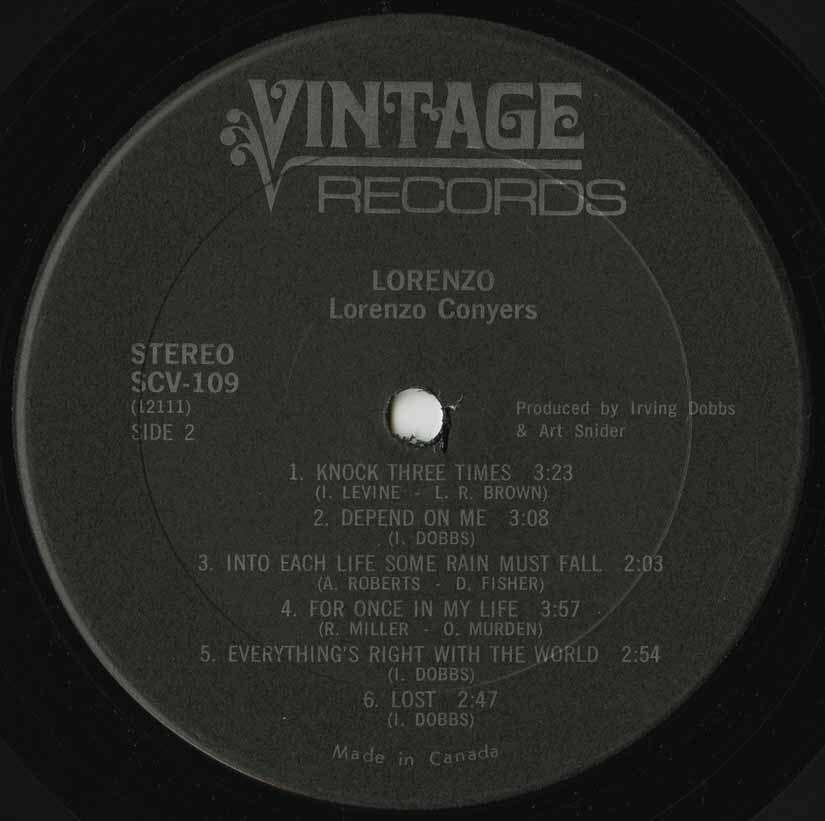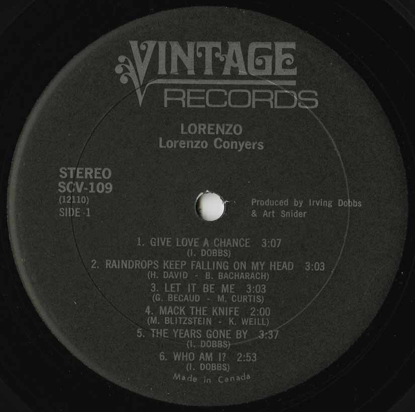 Conyers sang with the Ink Spots for nine years, starting in 1954 and continued singing up until his death in 1999. Born in Elizabeth, New Jersey, this was his first solo LP and features six new Canadian original compositions plus production by Toronto's Irving Dobbs.