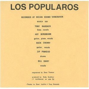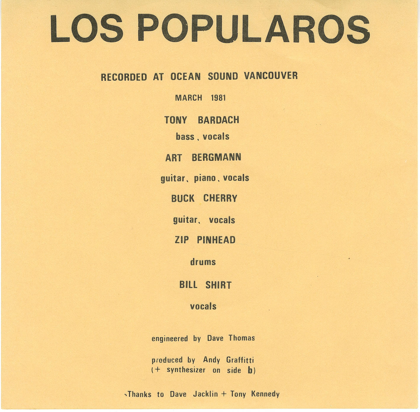In late 1980 Armstrong and Scherk were reunited in Los Radicos Popularos, a so-called fuck band that also included Art Bergmann, Tony Bardach, Zippy Pinhead and sometimes Gord Nicholl. By February 1981, with the demise of the Young Canadians and Modernettes, the band shortened their name to Los Popularos and became a full-time project. Los Popularos released two records: the 7-inch single Working Girls b/w Mystery To Myself (1981) and the Born Free 12-inch EP (1982). Los Pops toured North America a couple of times, but eventually called it quits in winter 1983. The following spring, Art Bergmann formed Poisoned, and went on to a long and storied career as a solo artist.
