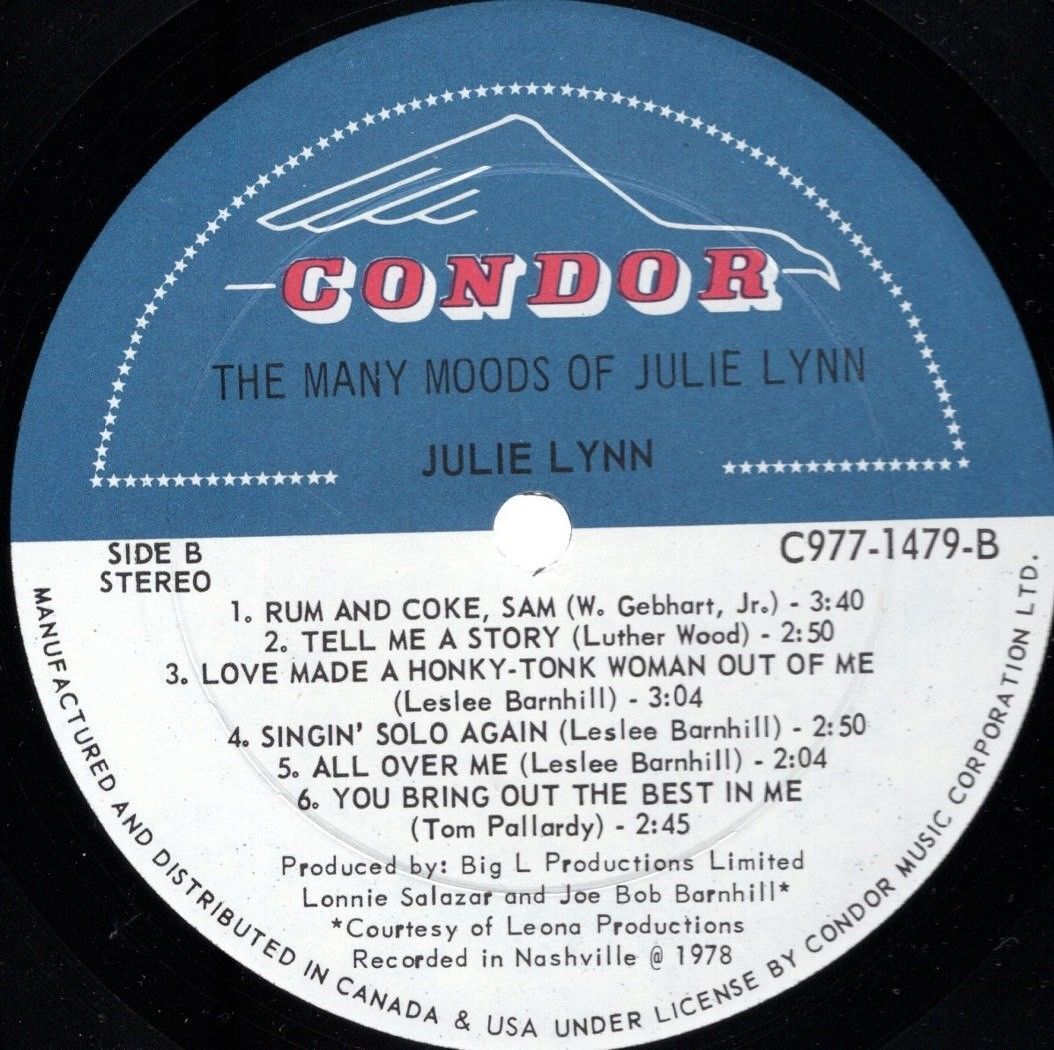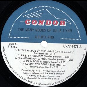 The first female artist inducted into the Ottawa Valley Country Music Hall of Fame, Julie Lynn (born Marie Julia Catherine Flynn, in Gaspe, Quebec, in 1947) got her start playing the bar circuit in northern Ontario as a teenager. After a stint performing with Pauline Noland and her Jamboree Pals - a gig that included a weekly television show on CHOV Pembroke - she formed The Julie Lynn Show in 1966. The Julie Lynn Show toured Canada for a number of years until Julie signed a contract with Dominion Records in 1970. Her debut album, “Put A Little Love In Your Heart”, was released that same year. The follow-up, “Look What They’ve Done To My Song”, (1971), produced Julie’s biggest hit, "Good Morning World" (#2 on the RPM Chart). Five other albums followed, including her final release, “The Many Moods Of Julie Lynn” (1978), a project that was recorded in Nashville with producers Lonnie Salazar and Joe Bob Barnhill. Julie and her band continued to tour Canada and the United States, opening concerts for Conway Twitty, George Hamilton IV, Tammy Wynette and Jack Greene. During this time, she made personal appearances on numerous television programs including The Family Brown Show, The Tommy Hunter Show and The Noel Harrison Show and also co-hosted the series “Comin’ Up Country” with Tim Daniels, produced by Cy True for the CBC Network, out of Halifax, Nova Scotia.