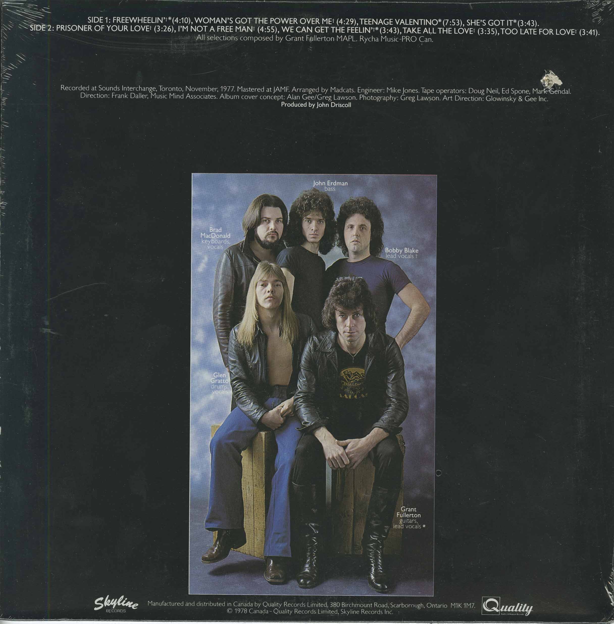 After the collapse of Fullerton Dam, Grant Fullerton and Brad MacDonald formed Madcats in 1977 feauring Bobby Blake on lead vocals (Mike McKenna Band). They were signed to Skyline Records and their self-titled debut was released, with a very risque front cover of a straight-jacketed woman in a cage, in 1978 through Quality, on gold coloured vinyl.