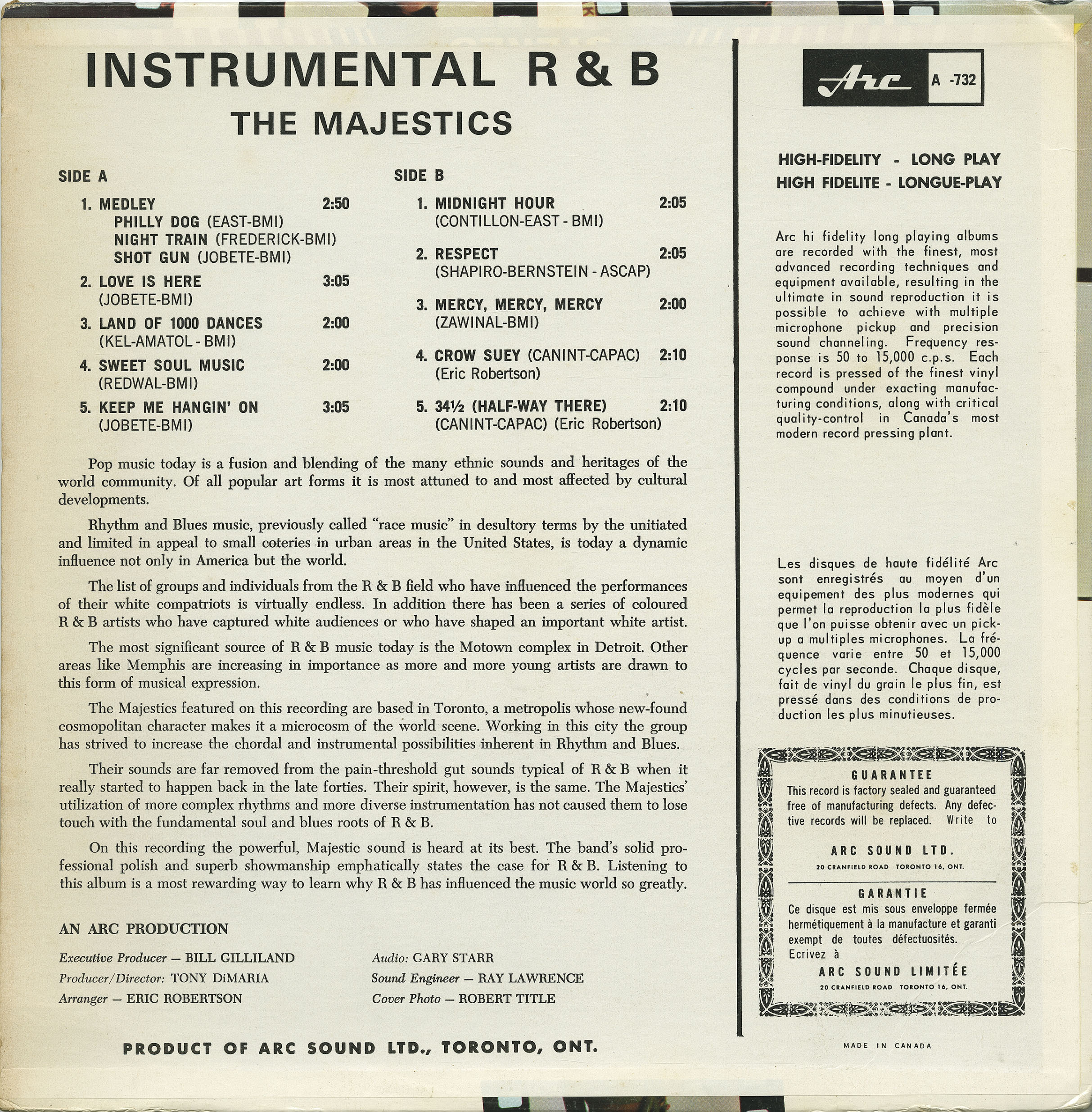 The Majestics featured on this recording are based in Toronto, a metropolis whose new-found cosmopolitan character makes it a microcosm of the world scene. Working in this city the group has strived to increase the choral and instrumental possibilities inherent in Rhythm and Blues.