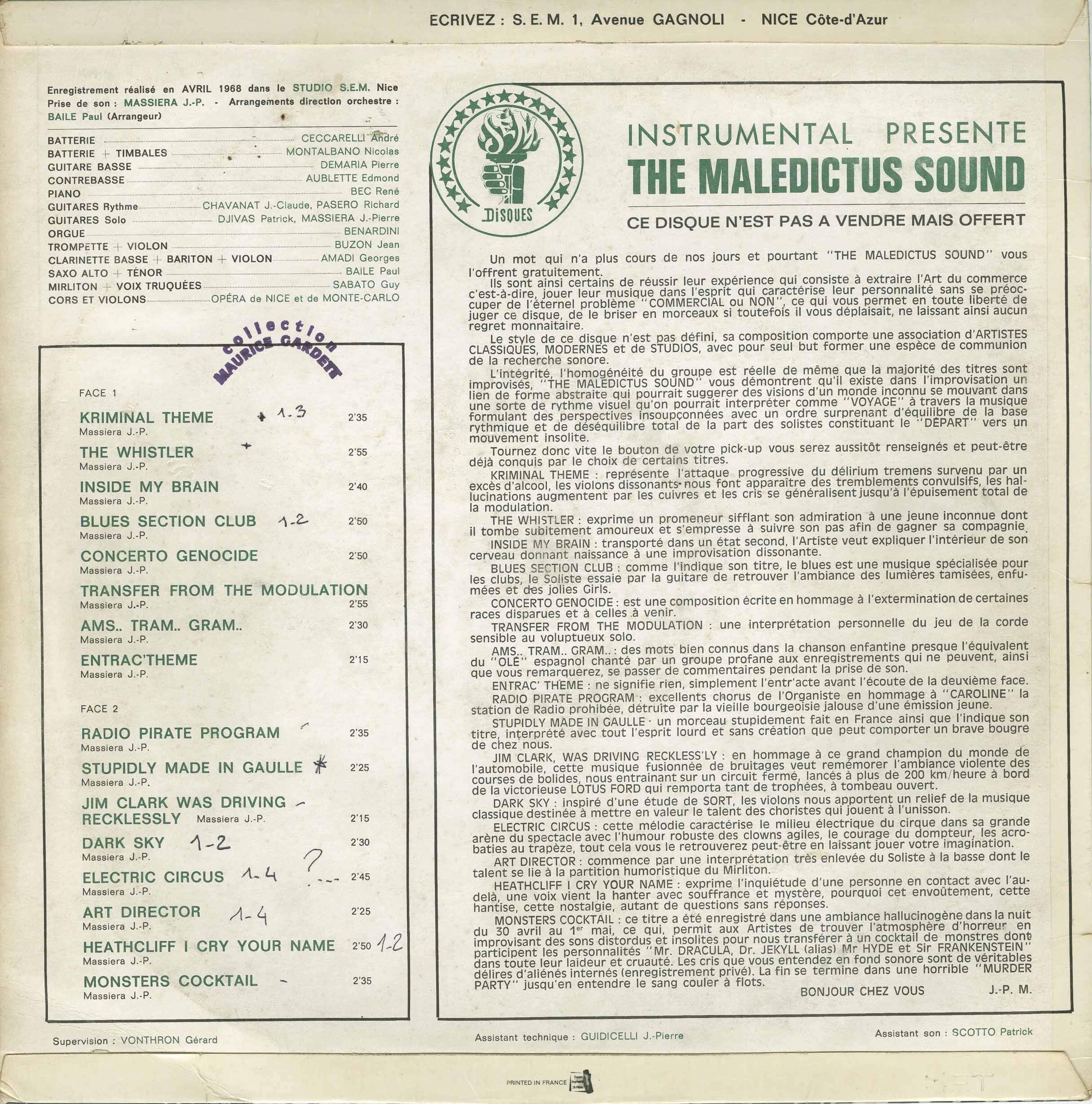 Les Maledictus Sound are to instrumental rock what Frankenstein was to science… a laboratory monster… a strange creature assembled from a mishmash of diverse musical sounds… psychedelic pop, romantic ballads, musical tongue-in-cheek, drugged out chipmunks, near-delirium sound effects, horror movie screamadelia and a mega-twisted 60s vibe… eclectic, epileptic… The doctor, here, is JEAN-PIERRE MASSIERA, the musical mastermind who gave birth to that monster.