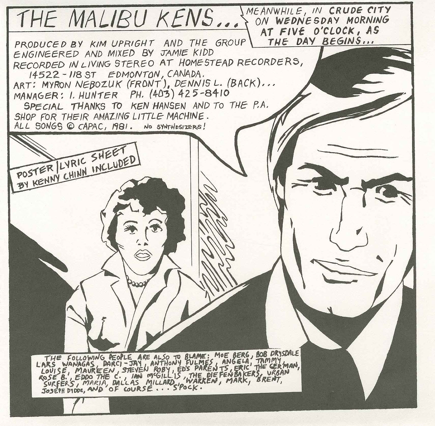 In 1981, the Malibu Kens released one of Edmonton's earliest independent punk singles, featuring "Crude City" and "Wednesday Morning at 5 O'Clock (As the Day Begins...)" on the Exploding Debut label. The single was co-produced by the band and Kim Upright of the Modern Minds, who later co-founded Jr. Gone Wild with Mike McDonald. The insert for the single was designed by Ken Chinn, also known as Mr. Chi Pig, who would later gain fame with SNFU.​