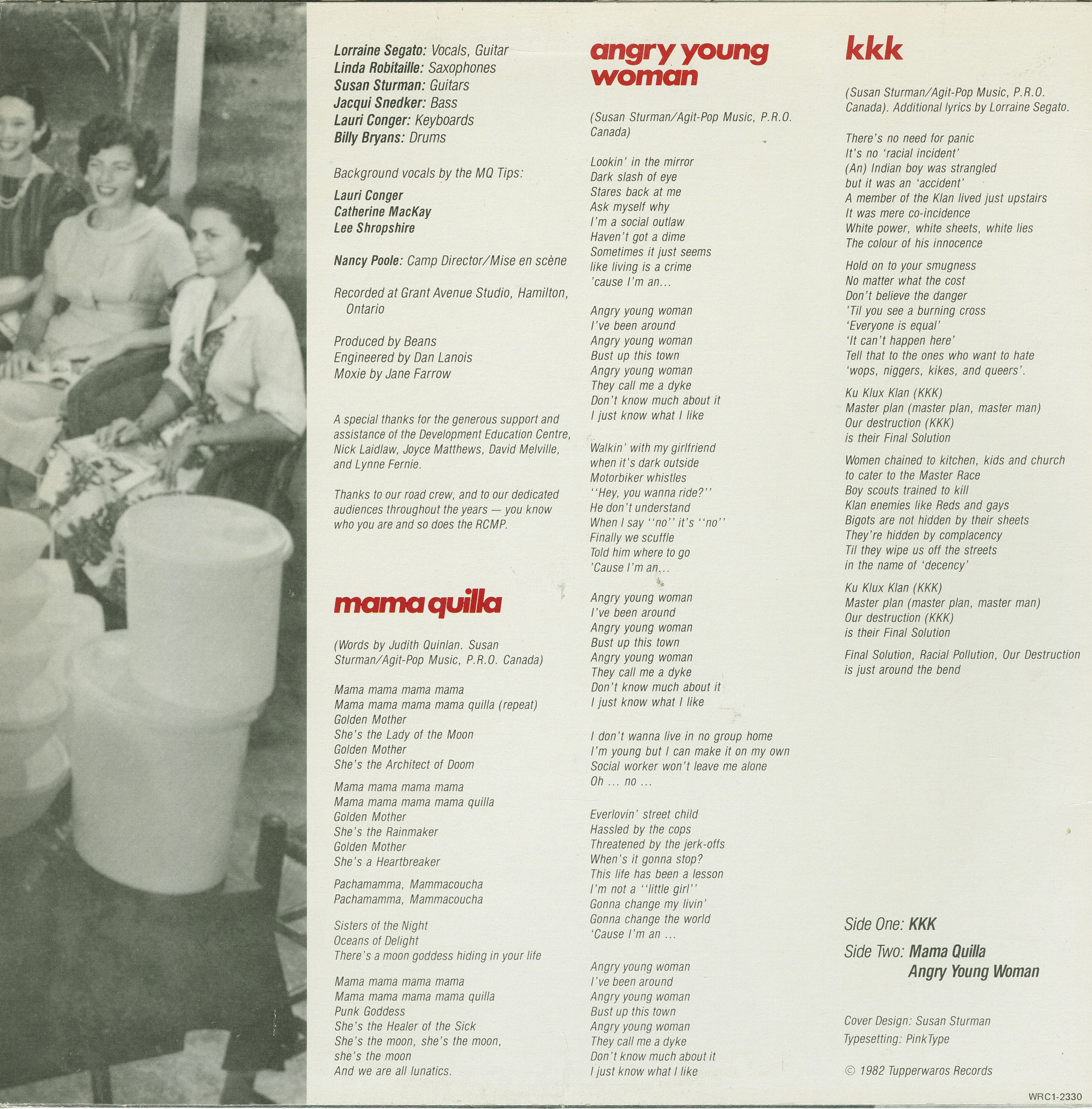 Canada’s first explicitly feminist rock band, Mama Quilla II emerged from the intersection of radical politics, art-school creativity, and Queen Street’s boundary-pushing music scene. Formed in the late 1970s, the group fused rock instrumentation with activist messaging, delivering confrontational and powerful songs like “Angry Young Woman” and “KKK” in clubs, festivals, and women’s spaces across the country.
