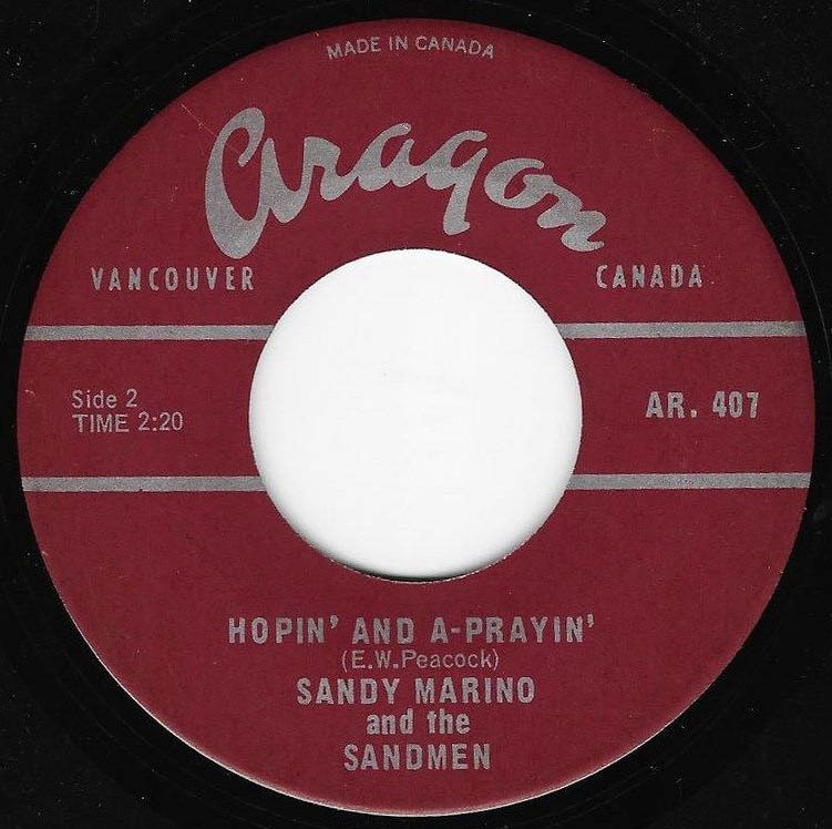 Sandy Marino And The Sandmen emerged from Evan Kemp's Trail Riders to form the Sandmen (lead guitarist Jigger Pine and bassist Sandy Marino had played on Evan Kemp's Aragon album 'Blue Canadian Rockies'). Singer-bass player Everett William Peacock, who became Sandy Marino, and the lead guitarist Lou Earl, who became Jigger Pine, were named by Evan Kemp who had a talent for renaming musicians. Lou recalls: "Evan had the name on his posters before he ever met Lou Earl. He was determined that the musician he hired would have comedic qualities that he could bring out, to make him a 'Jigger Pine'". It was a name Kemp had kept in mind since he'd seen the 1941 movie 'Blues in the Night', where character Jigger Pine was played by Richard Whorf. The drummer was Bruce Cox, and both Marino on acoustic guitar and Pine on electric guitar later overdubbed extra rhythm onto the driving number. Marino wrote the song here and the flip, Big Country. The Sandmen worked the legion halls and cabarets around Vancouver before touring the B.C. interior and booking the halls themselves as their old boss Evan Kemp had done. After touring Alaska, Jigger and Sandy parted ways with Pine joining Kenny Stolz and Sandy teaching school. Sandy reformed The Sandmen, but suffered a stroke which has left him unable to resume singing. He now lives in Salmon Arm, British Columbia.
