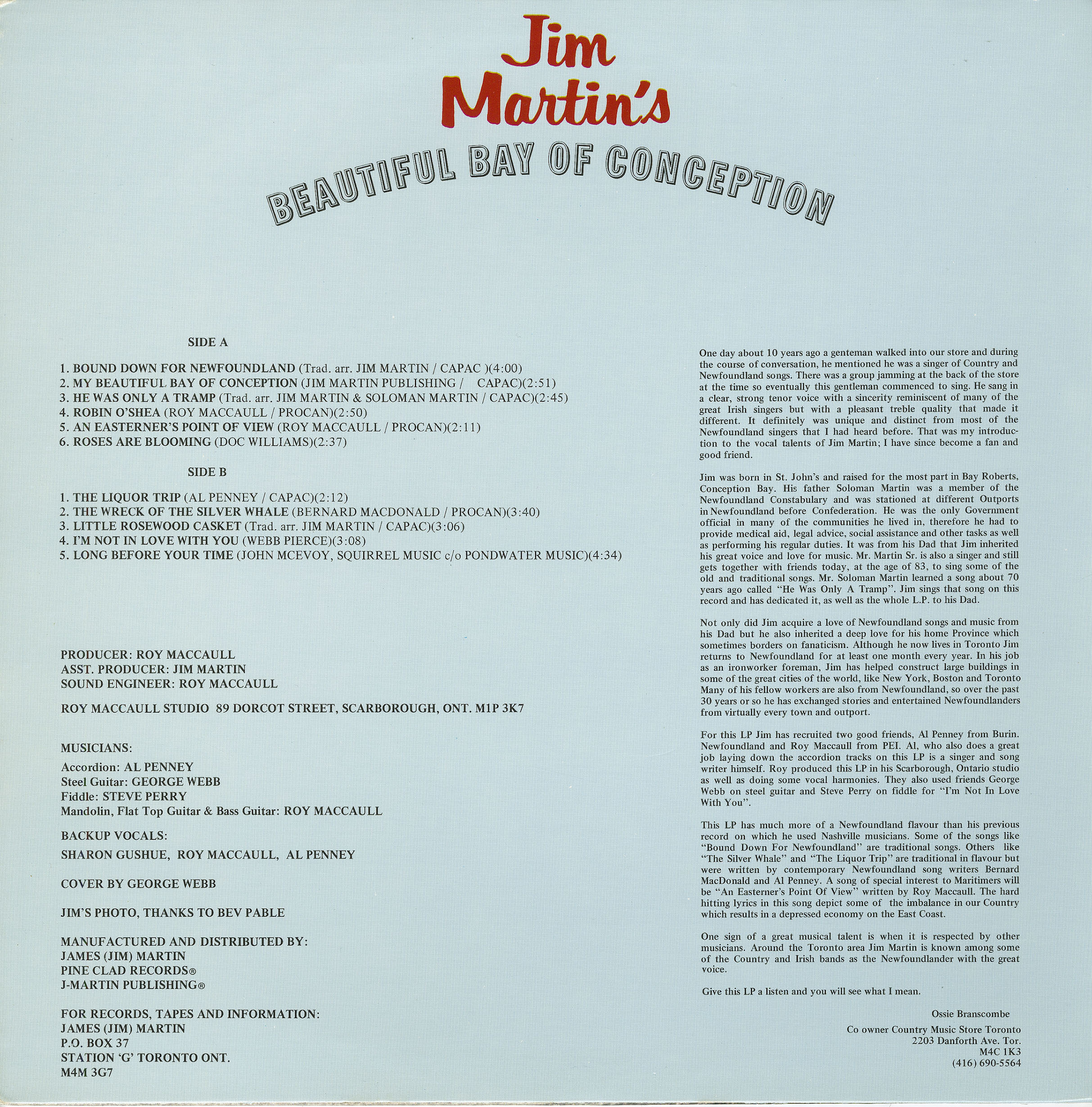 Long before the devastation of the north Atlantic cod stocks, Martin roasted the government of then Prime Minister Brian Mulroney for their folly in not protecting the Grand Banks of Newfoundland. "Beautiful Bay of Conception" is a ballad of leaving his beautiful wife and home to go to war in Europe, where he is shot by a nazi.