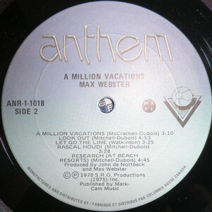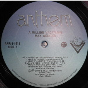 All is silky, ethereal, and crisp as winter snow on Max's most polished piece of studio jewelry, the band's lightest footprinted excursion. A Million Vacations chimes clear as a bell, the album lovingly layered with keyboards, buoyant with bright guitars and lush, letter-perfect harmonies. Highlight of the collection comes with what proved to be the band's biggest hit Paradise Skies, a masterwerk of dynamics and uncompromising professionalism with one of the most gushingly enjoyable drum sounds ever plucked from, then tweaked for, the airwaves. Other aural sculptures that spot and dot Max's moving target of offbeat inversion include the whacked-out Rascal Houdi, the live and unkempt Research (At Beach Resorts), the spring water-pure Charmonium, and last but not least, the good feeling boogie rockin' title track. The sounds on this truly awesome head trip simply ebb and flow as if the band were wrapped in a dream, all the while firmly rooted in an earthly and knowing pride in its obvious accomplishment, creating high upon high, working with a shared love of quality craftsmanship, eye askance to big brothers Rush for professional guidance. The final result is evident within the grooves, rhythms which just sing with enthusiasm, no small thanks to the album's state-of-the-art Maxmix. As history would have it, A Million Vacations is largely considered Max Webster's quintessential, defining work, most likely due to its maturity, accessibility, and seemingly elliptical but somehow comfortable cohesion, not to mention the (Canuck) hit status of no less than four songs: Paradise Skies, copasetic pop hummer Let Go The Line, airy prog masterpiece Night Flights, and to a lesser extent the title track. But to my mind, putting side such base and shackling commercial concerns, the record is merely yet another masterpiece comprising a body of work that baffles, elates, provokes and charmingly, good-naturedly pokes fun.