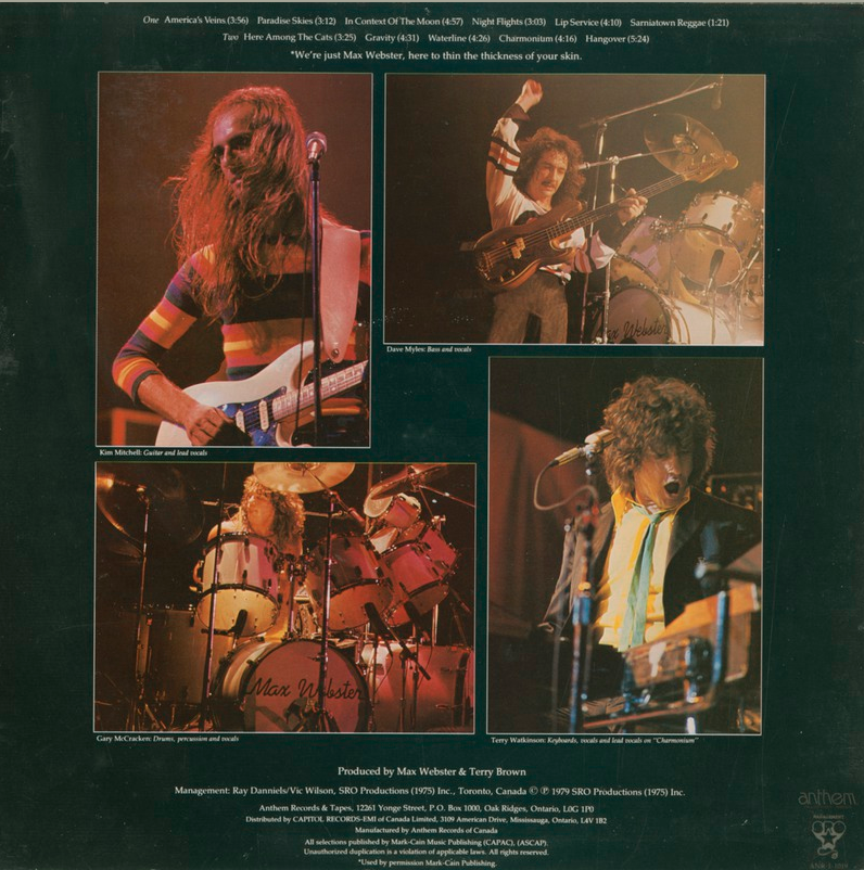 The closest me an' the buds ever came to viewing Max in the flesh (until '96's brief reunion tour) was being denied entrance (underage) at one of the band's near final shows at some bar in Nelson, B.C. We obviously missed a legend, a classic, cagey, canny circus act that cut its collective fangs on the cornerstones of technical brilliance, humour, artful restraint when required, and an uncommon attention to detail. So it's no surprise that Live Magnetic Air is a well-recorded and well-executed romp through some of Max's celebratory anthems, a veritable love-in of sound and galactic obtusion, a record demonstrating demonstrably a deft kid-gloving of heavy and light through the free 'n' easy juxtaposition of all the delicate hits with about a third of the band's acerbic noiseniks. I look into my crystal ball and pronounce that Max Webster will forever find a welcome home on Canadian classic rock airwaves, the band's sparkling arch-Canuck observations possessing the ability to reveal new hopeful possibilities for advancing waves of generations inexorably drawn to the fringes.