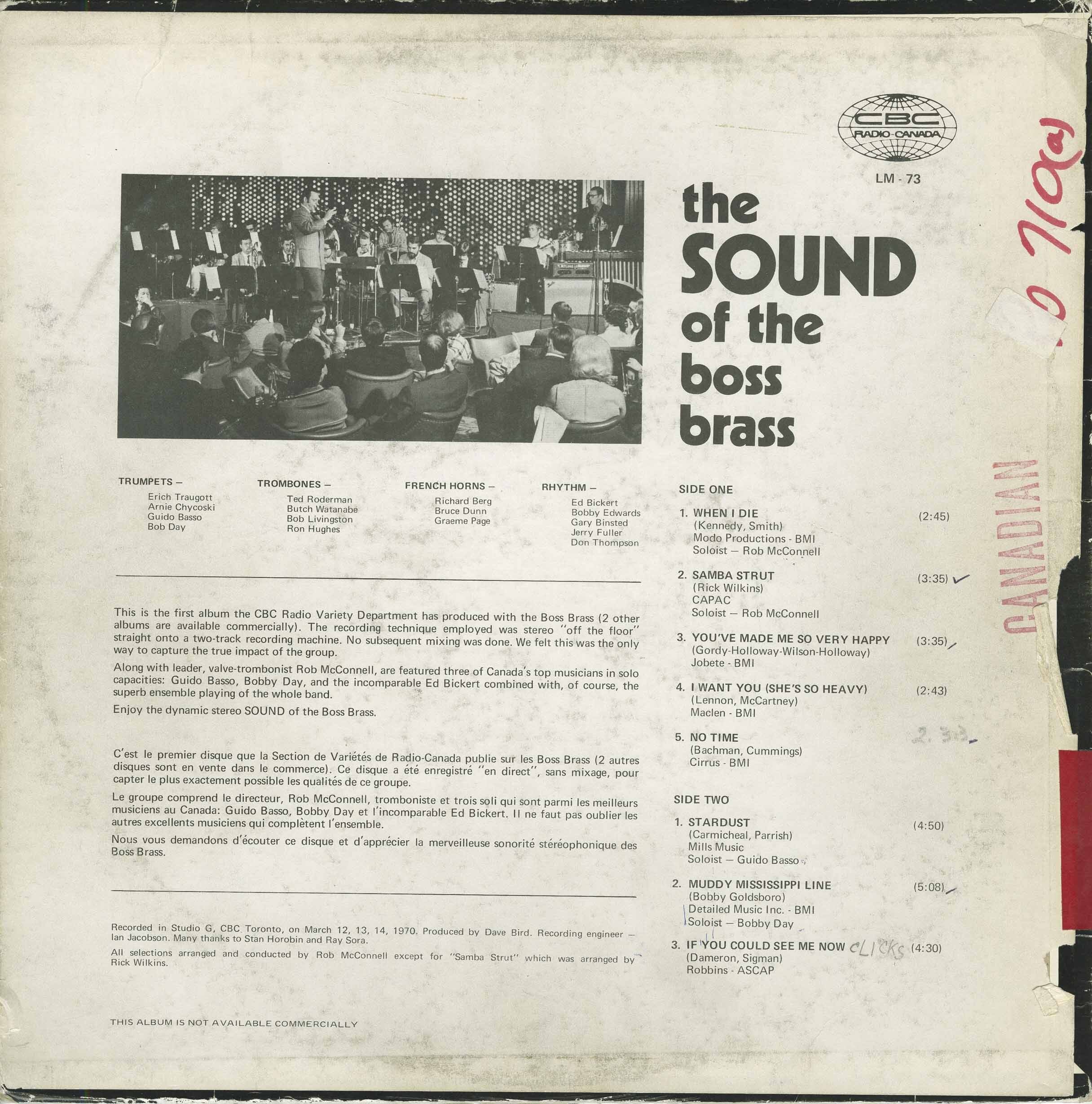 That vision became reality in 1968 with the birth of The Boss Brass, a sixteen-piece ensemble of Toronto’s finest studio musicians. The group’s sound was bold and unmistakable: four trumpets, four trombones, a pair of French horns, and a rhythm section, with no saxophones at first. In 1970 McConnell added a full woodwind section, and by 1976 the band had grown to twenty-two members. The result was a powerhouse outfit that set a new standard for big band music in Canada.