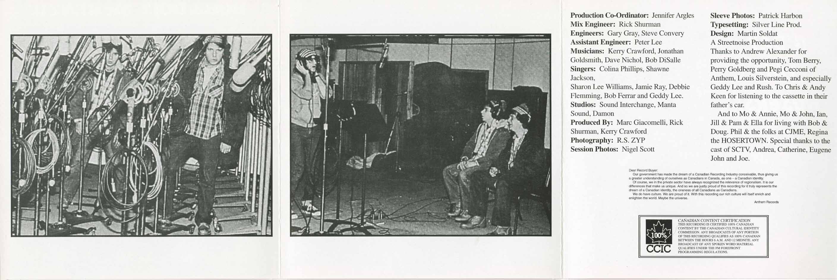 THIS RECORDING IS CERTIFIED 100% CANADIAN CONTENT BY THE CANADIAN CULTURAL IDENTITY COMMISSION. ANY BROADCASTS OF ANY PORTION OF THIS RECORDING QUALIFIES AS 100% CANADIAN BETWEEN THE HOURS 6 A.M. AND 12 MIDNITE. ANY BROADCASTS OF ANY SPOKEN WORD MATERIAL QUALIFIES UNDER THE PIP FOREGROUND PROGRAMMING REGULATIONS.