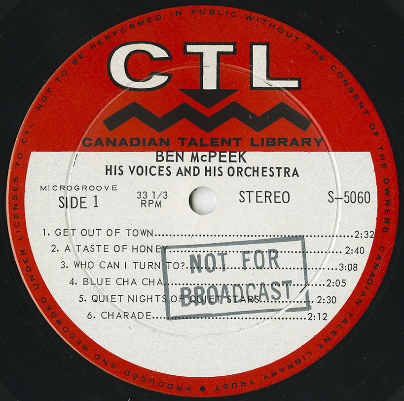 His first recorded album work came through the Canadian Talent Library. In 1966, McPeek released Colourful Configurations Conceived And Conducted By Ben McPeek (CTL M-1080), a mono LP that introduced him as a composer-arranger with a distinctive orchestral voice. The same recordings were subsequently retitled and reissued under various configurations, most notably as The Original Sounds Of Ben McPeek, His Voices And His Orchestra, appearing on Canadian Talent Library, RCA Victor, and later RCA Camden. These releases form the foundation of McPeek’s recorded catalogue and document his early orchestral and ensemble writing.