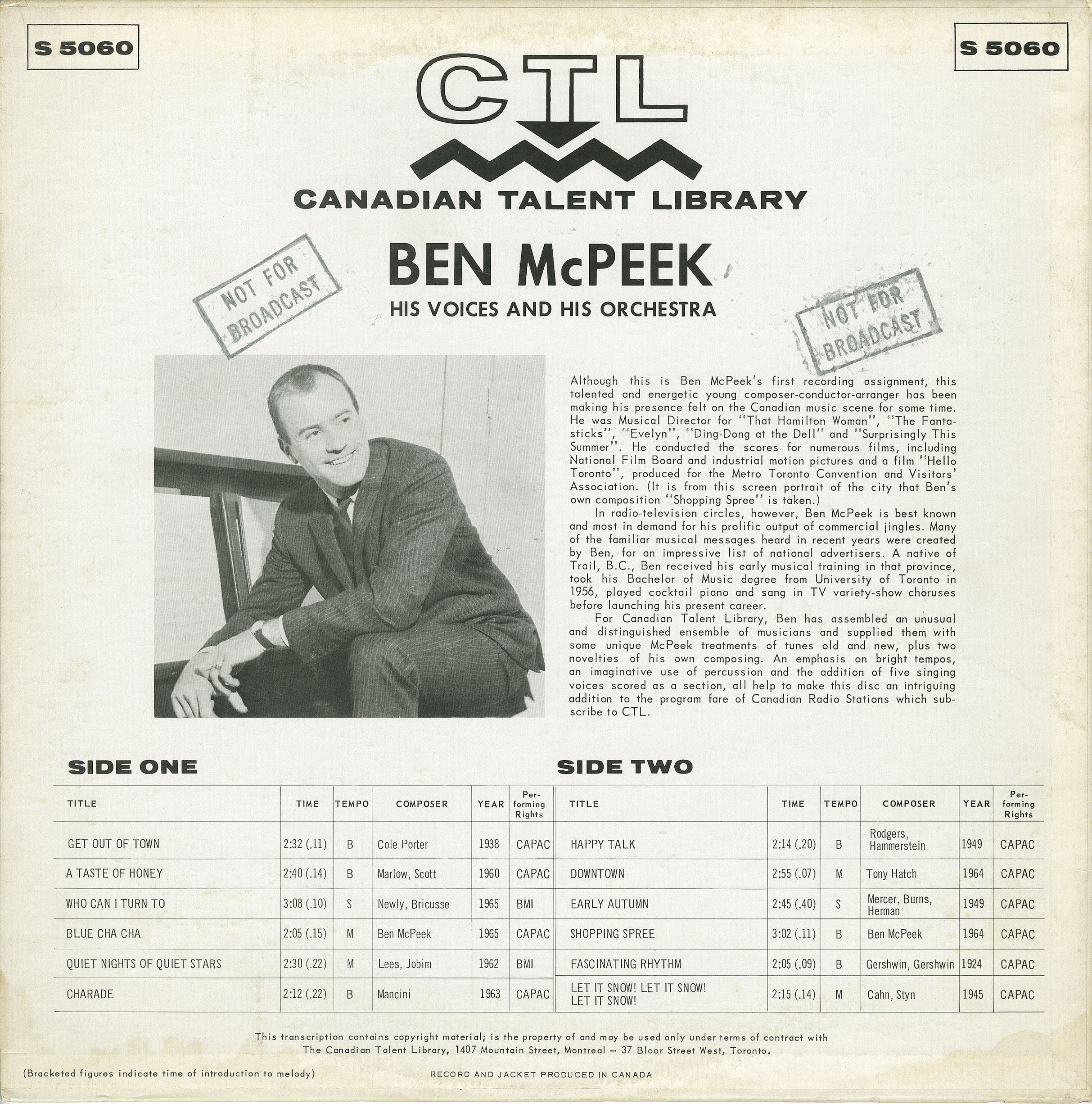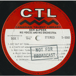 For Canadian Talent Library, Ben has assembled an unusual and distinguished ensemble of musicians and supplied them with some unique McPeek treatments of tunes old and new, plus two novelties of his own composition. An emphasis on bright tempos, an imaginative use of percussion and the addition of five singing voices scored as a section, all help to make this disc an intriguing addition to the program fare of Canadian Radio Stations which subscribe to CTL.