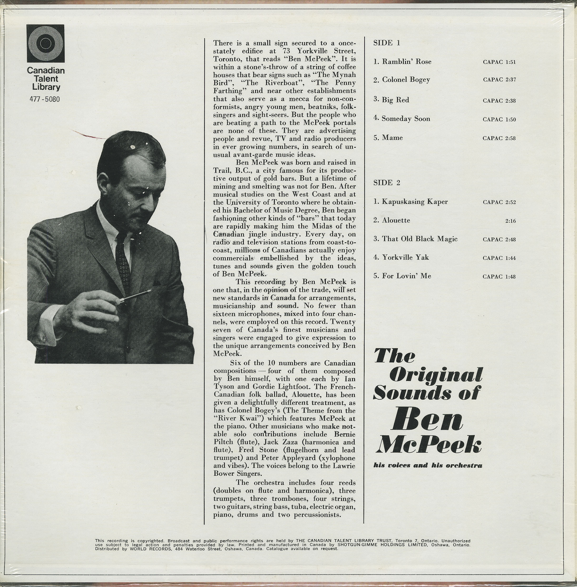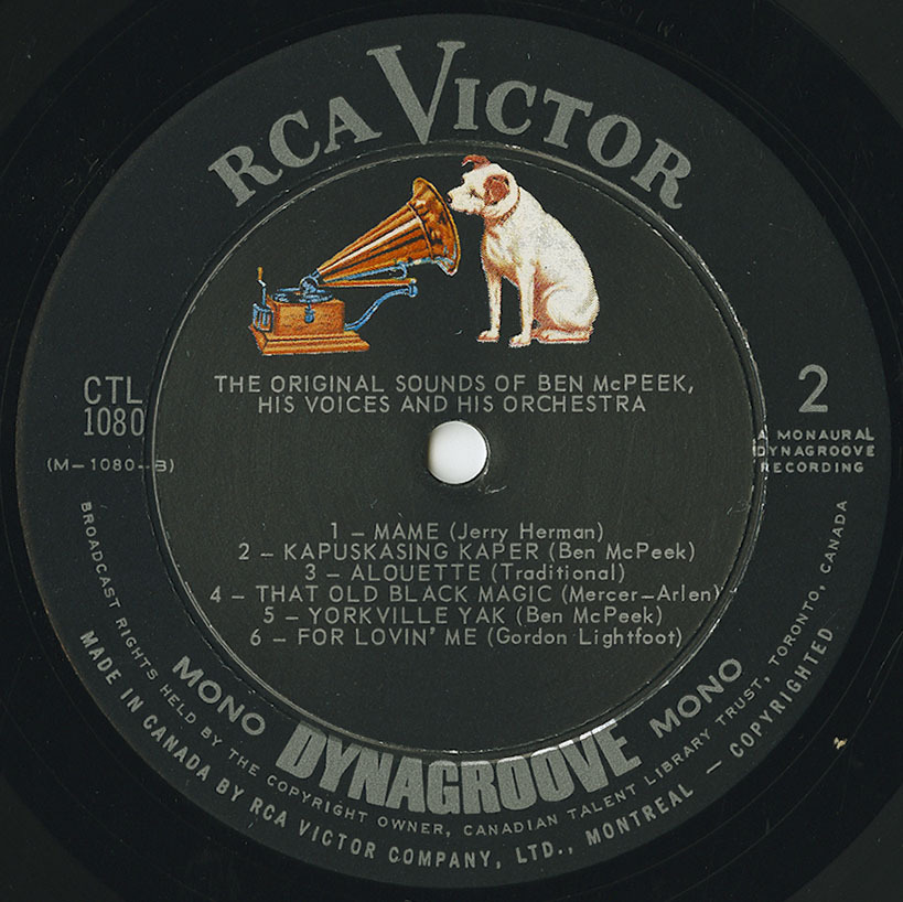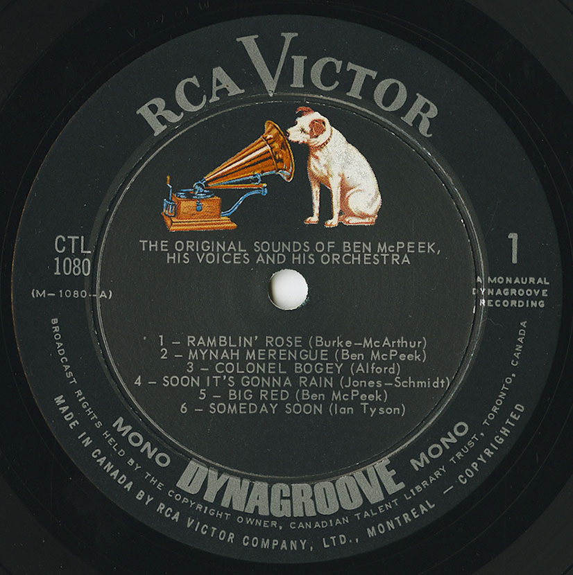 Six of the 10 numbers are Canadian compositions — four of them composed by Ben himself, with one each by Jan Tyson and Gordie Lightfoot. The French-Canadian folk ballad, Alouette, has been given a delightfully different treatment, as has Colonel Bogey’s “The Theme from the ‘River Kwai’” which features McPeek at the piano. Other musicians who make notable solo contributions include Bernie Piltch (flute), Jack Zaza (harmonica and flute), Fred Stone (flugelhorn and lead trumpet) and Peter Appleyard (xylophone and vibes). The voices belong to the Lawrie Bower Singers.