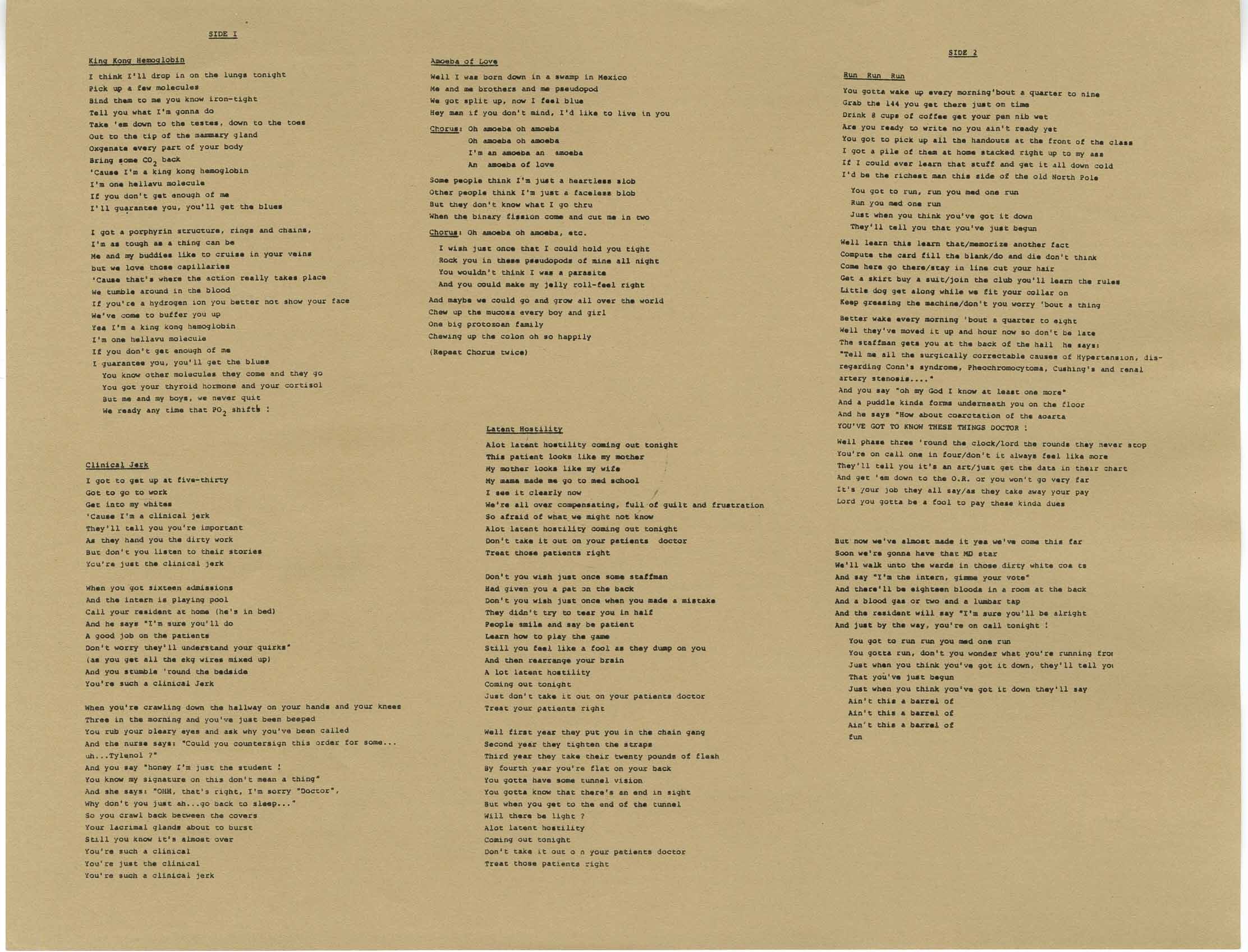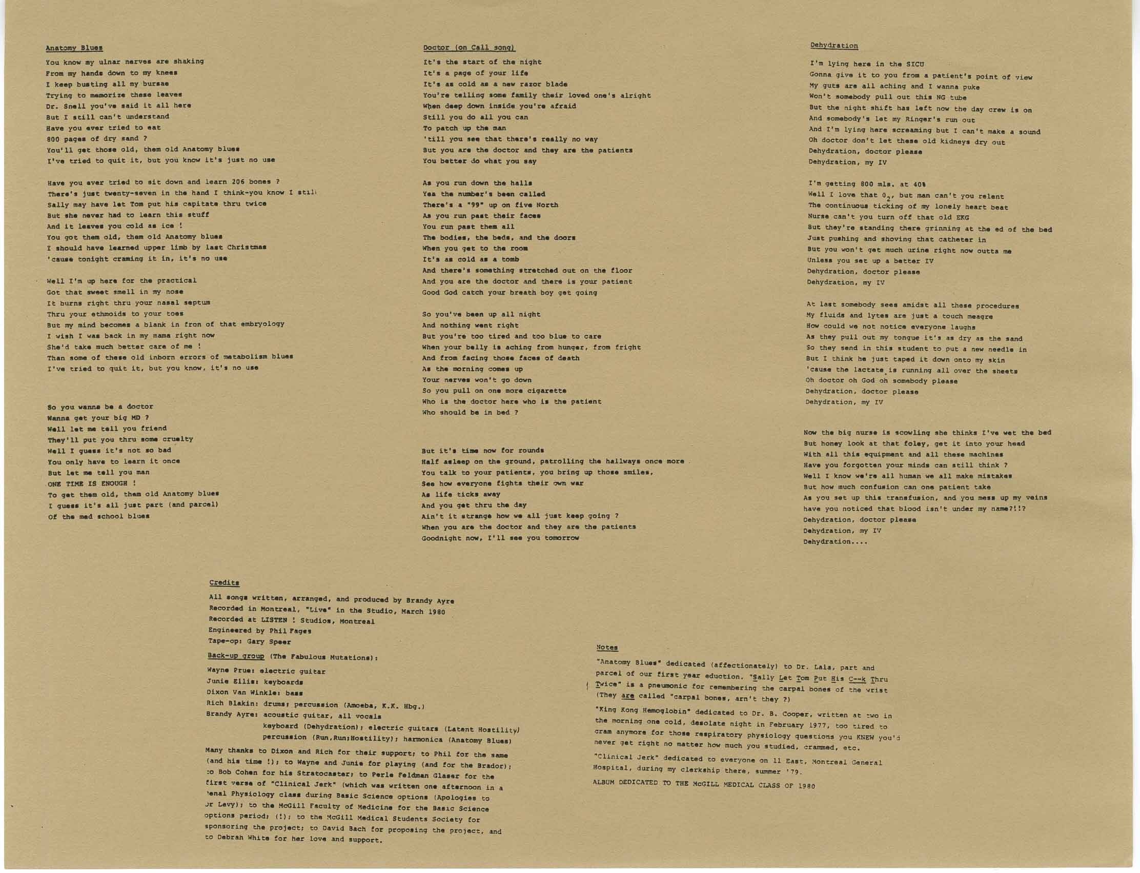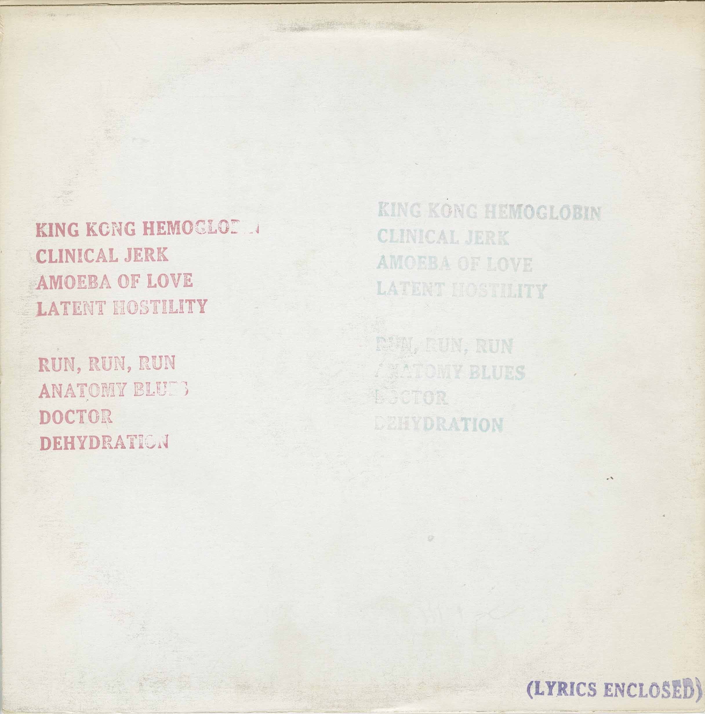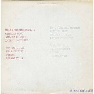 the band consisted of medical students from Montréal, most tracks are good blues/rock tracks, acoustic and full band, with keys, electric and acoustic guitars, percussion, drums, and bass, the brain blower here is a track called Dehydration, about a patient lying in a hospital and lost his IV, kinda crazy medical lyrics, and dripping acidy fuzz guitar through, a total mind blower!, other lyrics include:... "i think i'm gonna drop in on the lungs tonight", "well i was born down in the swamp in mexico, me and me brothersand me pseudopod, we got split up now i feel blue, hey man if you don't mind i'd like to live in you", lots of crazy lyrics and some song titles are: anatomy blues, amoeba of love, clinical jerk, and more, a very cool lp and with the winner fuzz burner "Dehydration" puts the icing on the cake! included lyric insert.