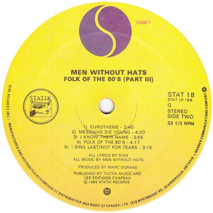Folk of the 80's (Part III) is the second studio album by Canadian synthpop group Men Without Hats, released in early 1984. The album reached #127 on the U.S. Billboard 200 albums chart. It was the band's final album with the lineup consisting of Ivan Doroschuk (vocals), Stefan Doroschuk (guitar), Colin Doroschuk (keyboards) and Allan McCarthy (keyboards).