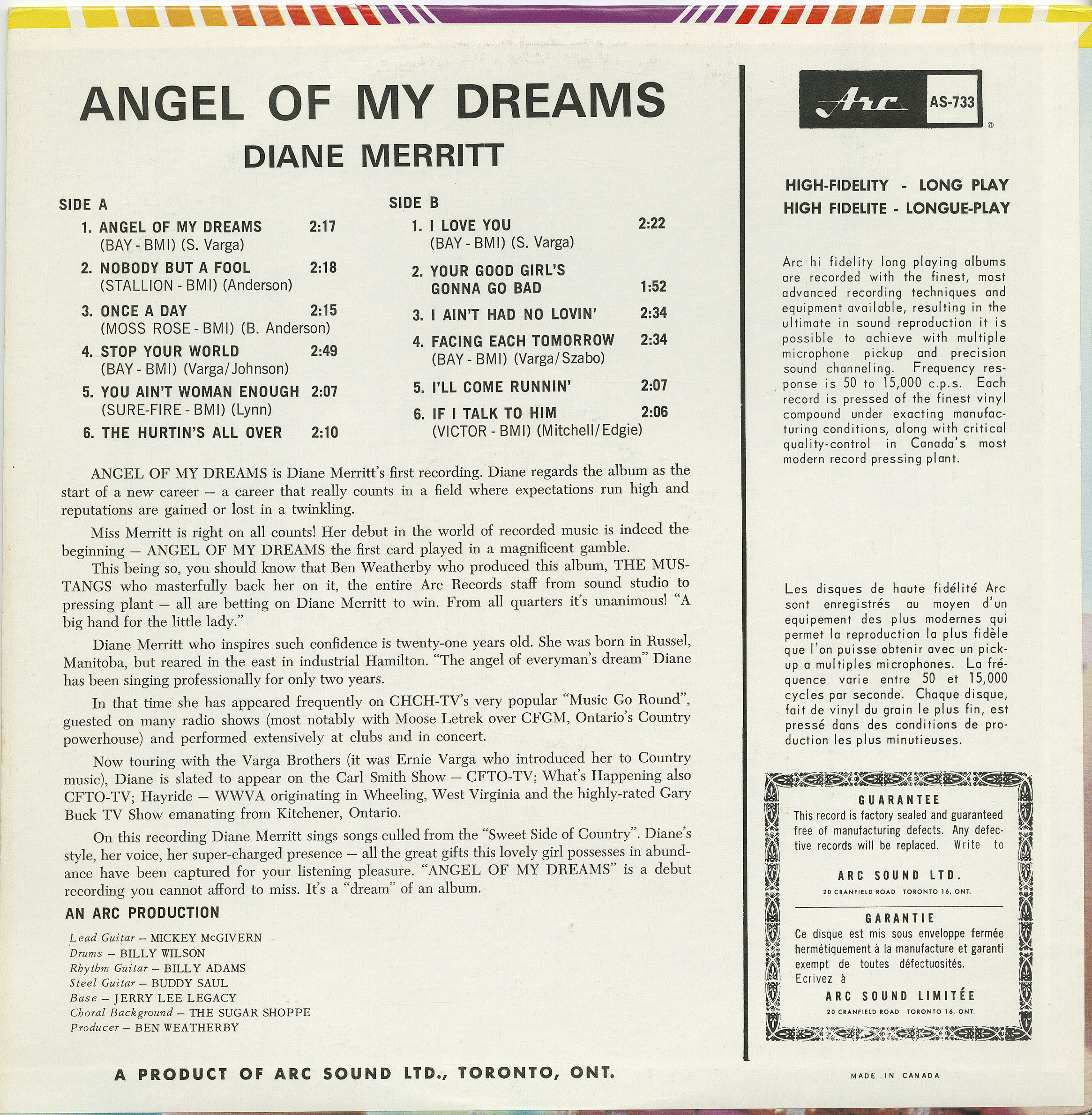 In 1972, Merritt recorded her debut album, Angel of My Dreams, for Arc Records. Produced by Ben Weatherby and backed by The Mus-Tangs, the LP presented her from what the label described as the “sweet side of country,” combining contemporary Nashville material with a polished studio sound. The album featured musicians including Mickey McGivern, with choral background vocals by The Sugar Shoppe, placing Merritt within a professional Canadian studio environment at a time when female country vocalists were gaining increased visibility.