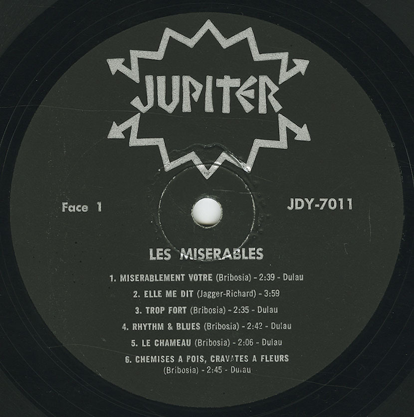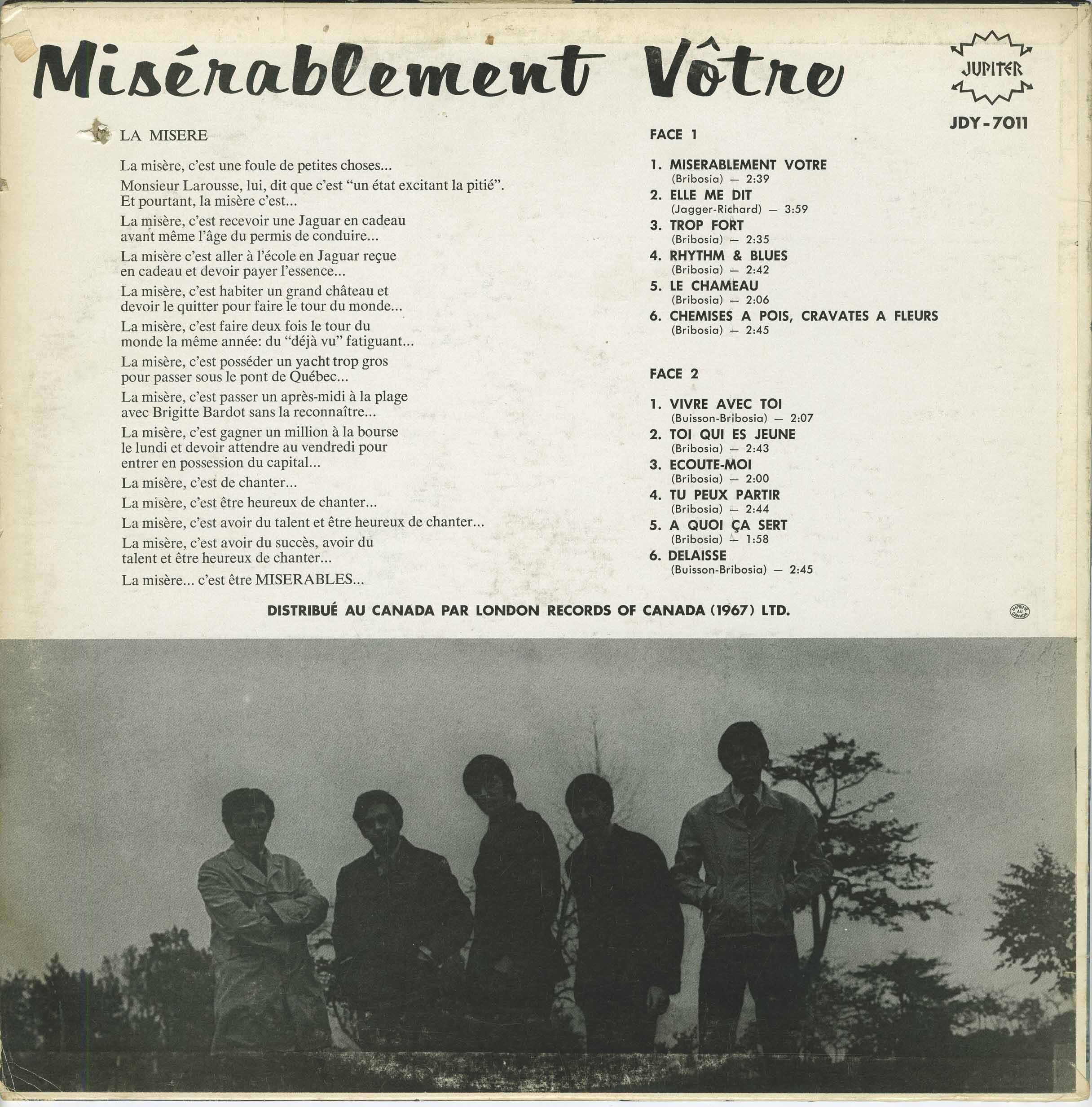 Unlike many of their contemporaries who primarily performed French translations of English-language hits, Les Misérables insisted on recording original material. "Despite the 60s practice to manage the big hits of the time, Les Misérables followed their creativeness by betting almost everything on their self-penned compositions." Their persistence paid off in 1966 when "Chemise à Pois, Cravates à Fleurs" ("Polka Dot Shirts and Flowered Ties") became a breakthrough hit. This success convinced Jupiter Records to finance a full-length LP, Miserablement Votre (Jupiter JDY-7011), which remains a sought-after artifact of 1960s Canadian garage rock.