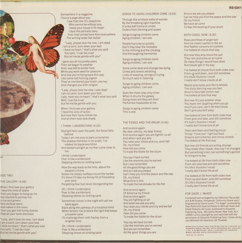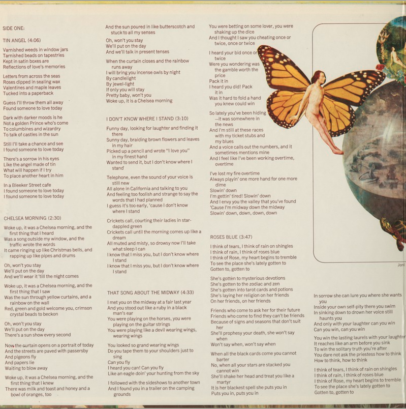 It's unsurprising that critics have often alluded to Mitchell's offerings as songs of innocence and experience. Unlike William Blake, however, Mitchell seems unable to separate these two mindsets. Twenty five when the album was released, she appears both naive and world-weary; forced, on "I Don't Know Where I Stand", to acknowledge the complexities and doubts new love brings while celebrating its dopamine-fuelled rush. "Picked up a pencil and wrote 'I love you' in my finest hand", she sings, "Wanted to send it, but I don't know where I stand". Like the "varnished weeds in window jars" and "roses dipped in sealing wax" that she describes on the meditative, minor-key "Tin Angel", she's frozen in a state of youthful purity. Unlike them, though, she's susceptible to a wisdom that grows with age. In fact, she even spells this out towards the end of the album: "Songs to ageing children come/Ageing children, I am one".