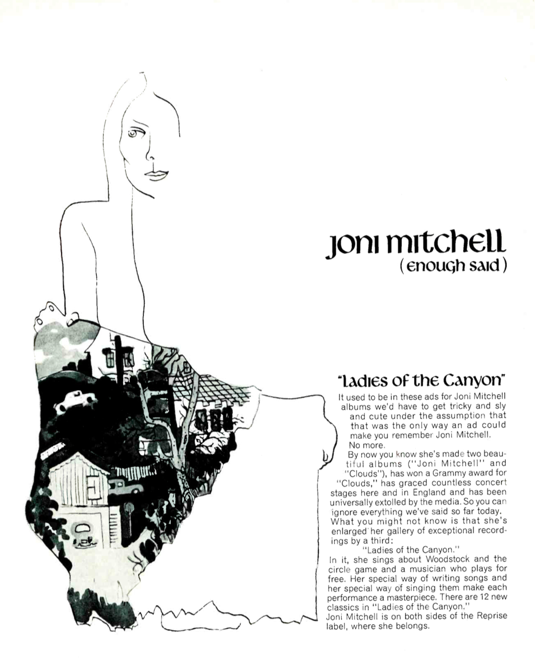 Joni's third album overflows with remarkable images - "The thirty-third floor in the air"; "With your father's gun alone"; "The face of the conquered moon" - but one looms over all the others. It is the line in "Woodstock" that describes jet bombers "turning into butterflies above our nation". Rarely has both the terror and the idealism of the late 1960s been so powerfully wrought, the competing forces of the times so perfectly evoked. The image spoke to a nation and a generation, but it also holds a metaphorical significance for the 26-year-old woman who wrote and sang it. Ladies Of The Canyon is the sound of Mitchell cracking out of her chrysalis and starting to soar.