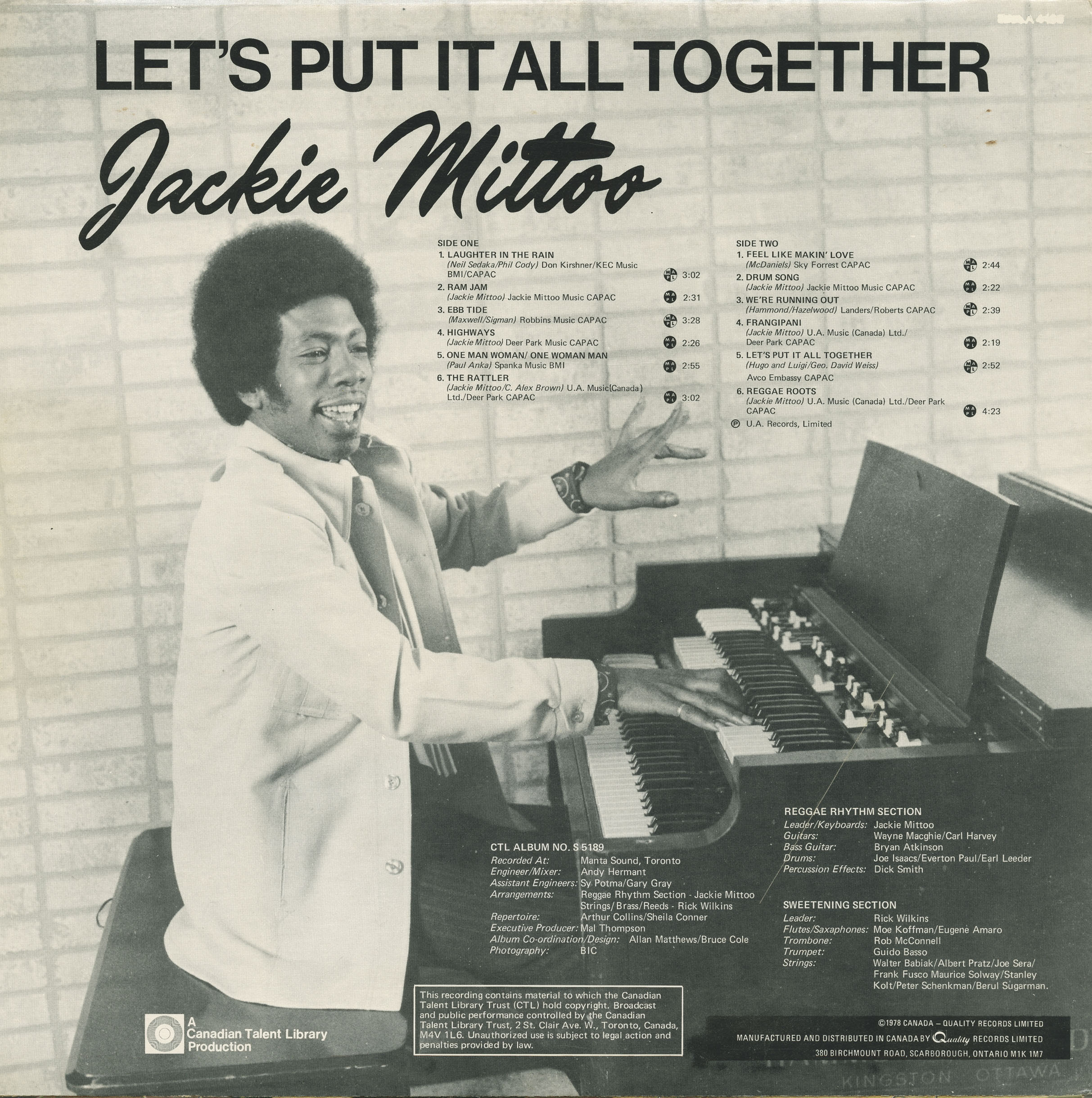 Recorded at Manta Sound Studios in Toronto, Let’s Put It All Together finds Jackie Mittoo at a mature phase in his career—firmly rooted in Canada but still carrying the unmistakable rhythms, instincts, and sensibilities of his Jamaican origins. Released through the Canadian Talent Library—a government-supported initiative designed to promote Canadian content on radio and in public institutions—the album captures Mittoo working in a highly professional studio setting alongside some of the country’s top jazz, soul, and reggae musicians.