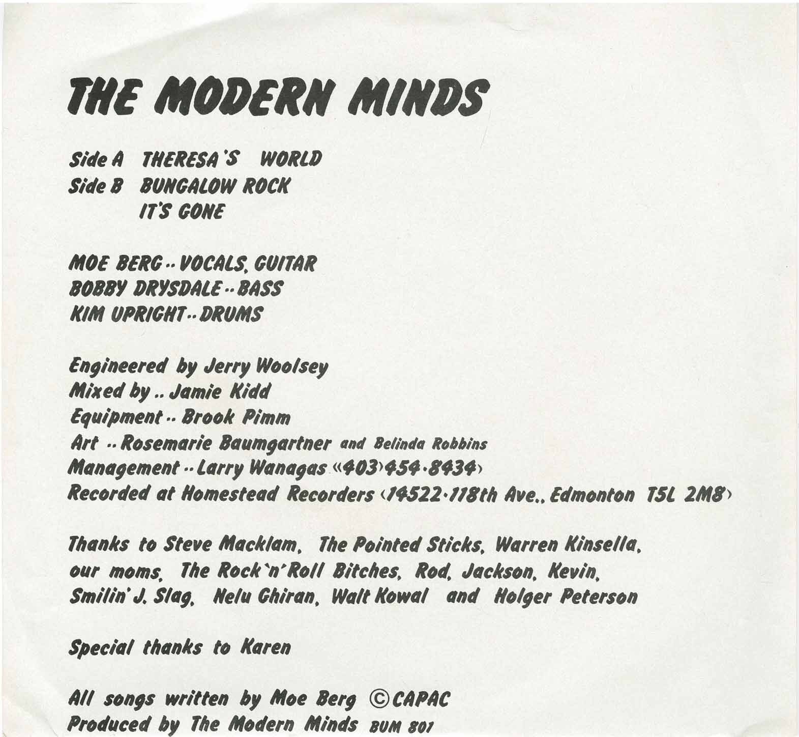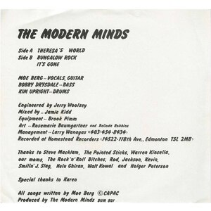 Modern Minds were a pioneering power-pop and new wave band from the Edmonton suburb of St. Albert, Alberta. The trio—Moe Berg (vocals, guitar), Bob Drysdale (bass), and Kim Upright (drums)—formed officially in January 1979, though their musical roots extended much earlier. As childhood friends in St. Albert, Upright and Drysdale began jamming in elementary school and eventually teamed up with classmate Graham Brown to form their first group, Stones, in junior high. By high school, the band evolved into Hot Toddy, and later, Modern Minds.