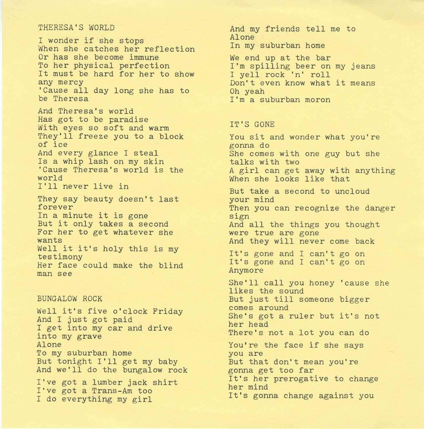 Their only official release during their original run, the three-song 7" single Theresa’s World (1980, Bumstead Records), was first posted to citizenfreak on Sept 9, 2012 and has since become a cult favorite among collectors of Canadian punk and power pop. With its jagged guitar hooks and earnest vocals, the single showcased Berg’s emerging songwriting talent—melodic, witty, and emotionally charged.