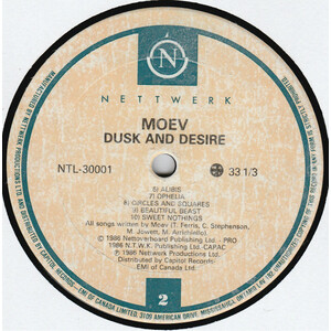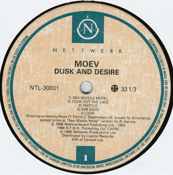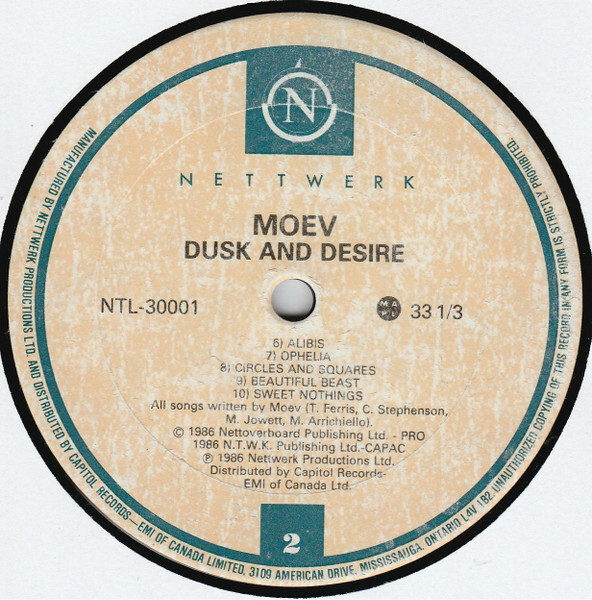 Jowett and Moev manager Terry McBride founded Nettwerk in 1984 so that Moev's material could be honestly and sufficiently released. Several singles were later issued, and also during this time, Morris left the band and Stephenson assumed full-time vocal duties. Michella Arrichiello stepped in a year later to become co-lead vocalist alongside Stephenson, and Moev signed a deal with Profile Records. Their sophomore effort Dusk and Desire was released to critical acclaim in North America in December 1985, yet a shift in band members continued to riddle Moev of complete creative concentration. (AMG)