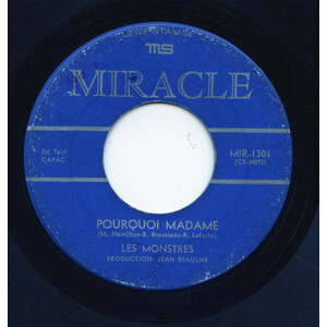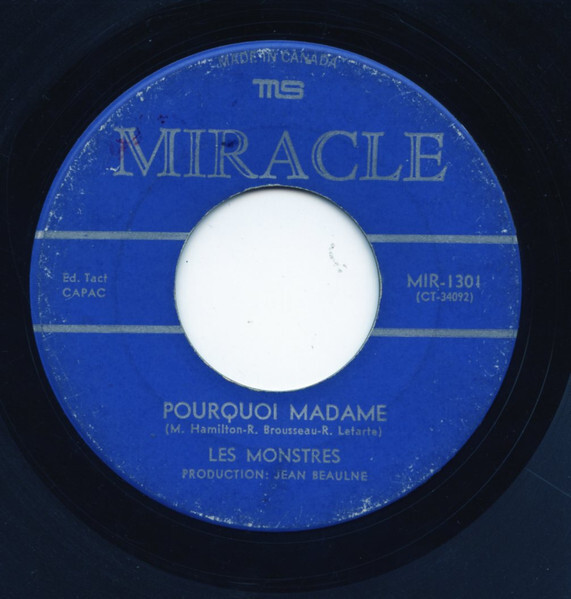 The group released two 45s. Their debut, Le Monstre Mash b/w Le Thème du Cimetière (Blue Jean BJ-2804, 1965), produced by Denis Pantis, offered a francophone adaptation of Bobby “Boris” Pickett’s novelty hit backed with a brooding instrumental built from clanking chains and reverb-drenched guitar. A year later Miracle issued the follow-up Pourquoi Madame b/w Je Veux Une Réponse (MIR-1301, 1966), co-written by Hamilton, Roger Letarte and Brousseau. That single leaned toward melodic garage pop with brass touches and tighter arrangements, showing the band edging past straight novelty.