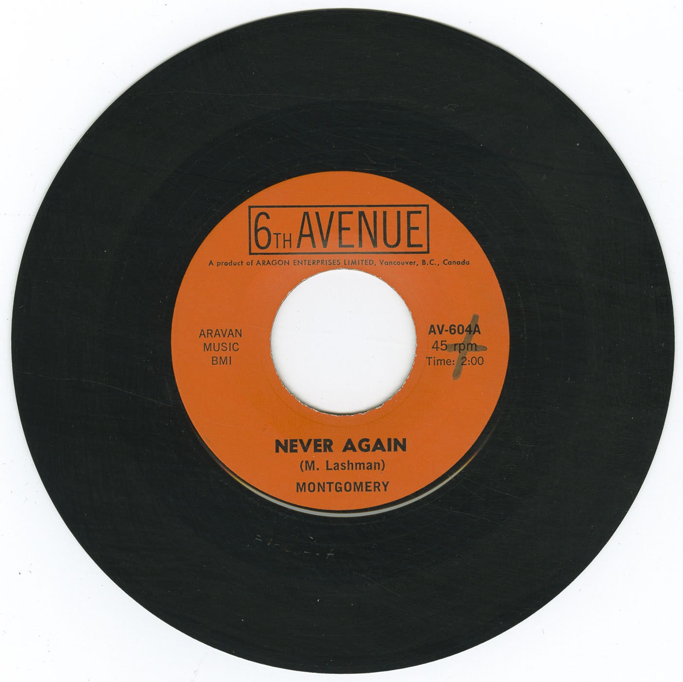 Released in 1969 on 6th Avenue Records, the companion imprint to Al Reusch’s Aragon Recording Studios, this single is among the rarer garage-psych titles in the catalog. Little is known of the artist Montgomery beyond this release, which adds to its mystique. 6th Avenue served as a chronicle of Vancouver’s late-1960s music scene, issuing records by Sy Risby, Alan Moberg, The Canucks Ltd., Patti MacDonnell, Joe Bradley, and others.