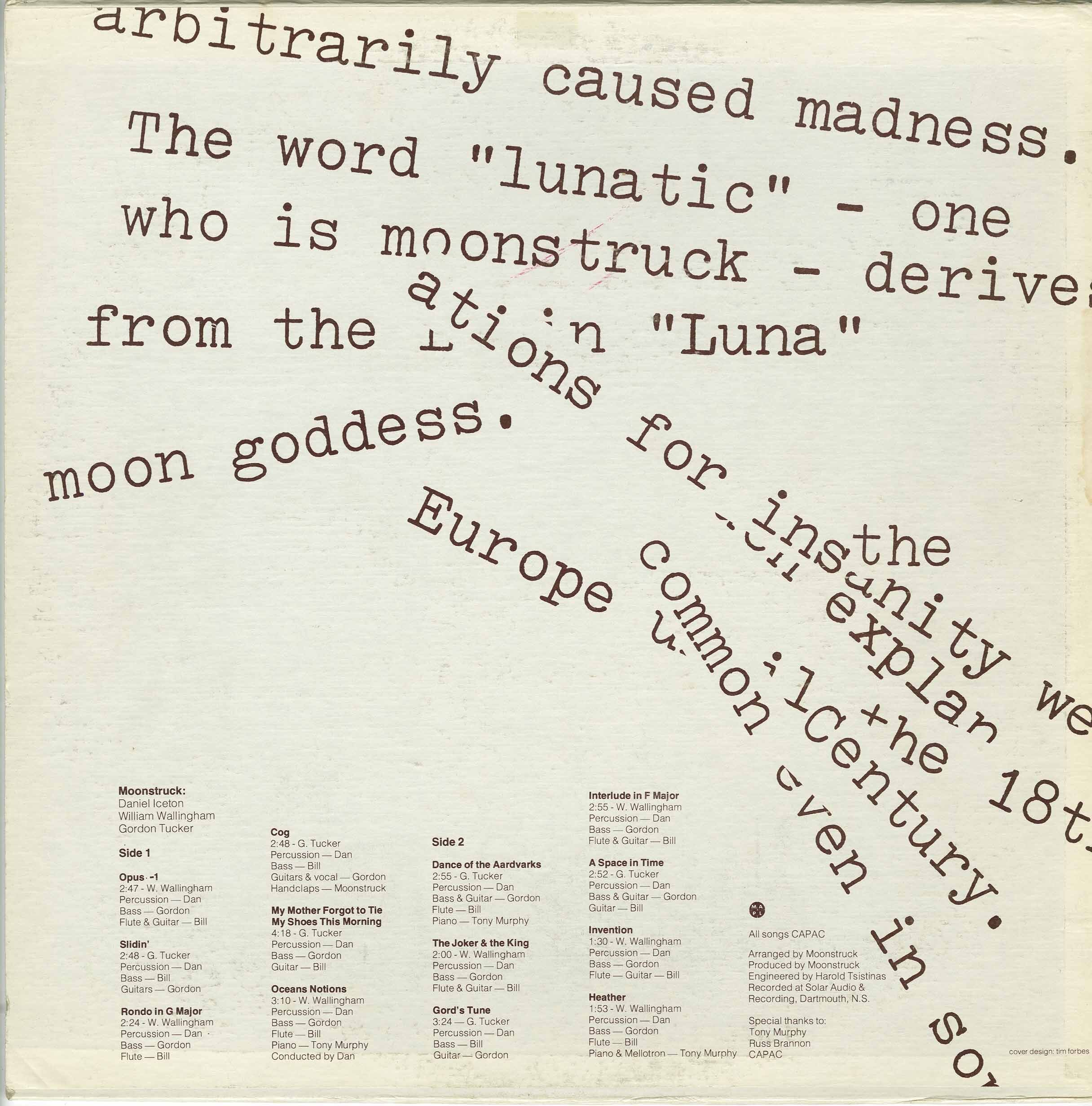Scarce mid 70's Private Pressing from Nova Scotia Instrumental Progressive with strong guitar, flutes, piano and some mellotron with Jazzy overtones. Progressive jazz trio, with guitar & flute, bass and drums. Mainly instrumental, with short, but very dynamic songs. The first version of Moonstruck was a cover band. The line-up of Tucker, Wallingham and Iceton recorded self-titled album in 1976 and released it on the band's own "Lunatunes" label. Tony Murphy played piano on two tracks. This version of the band did mostly original music when playing live.